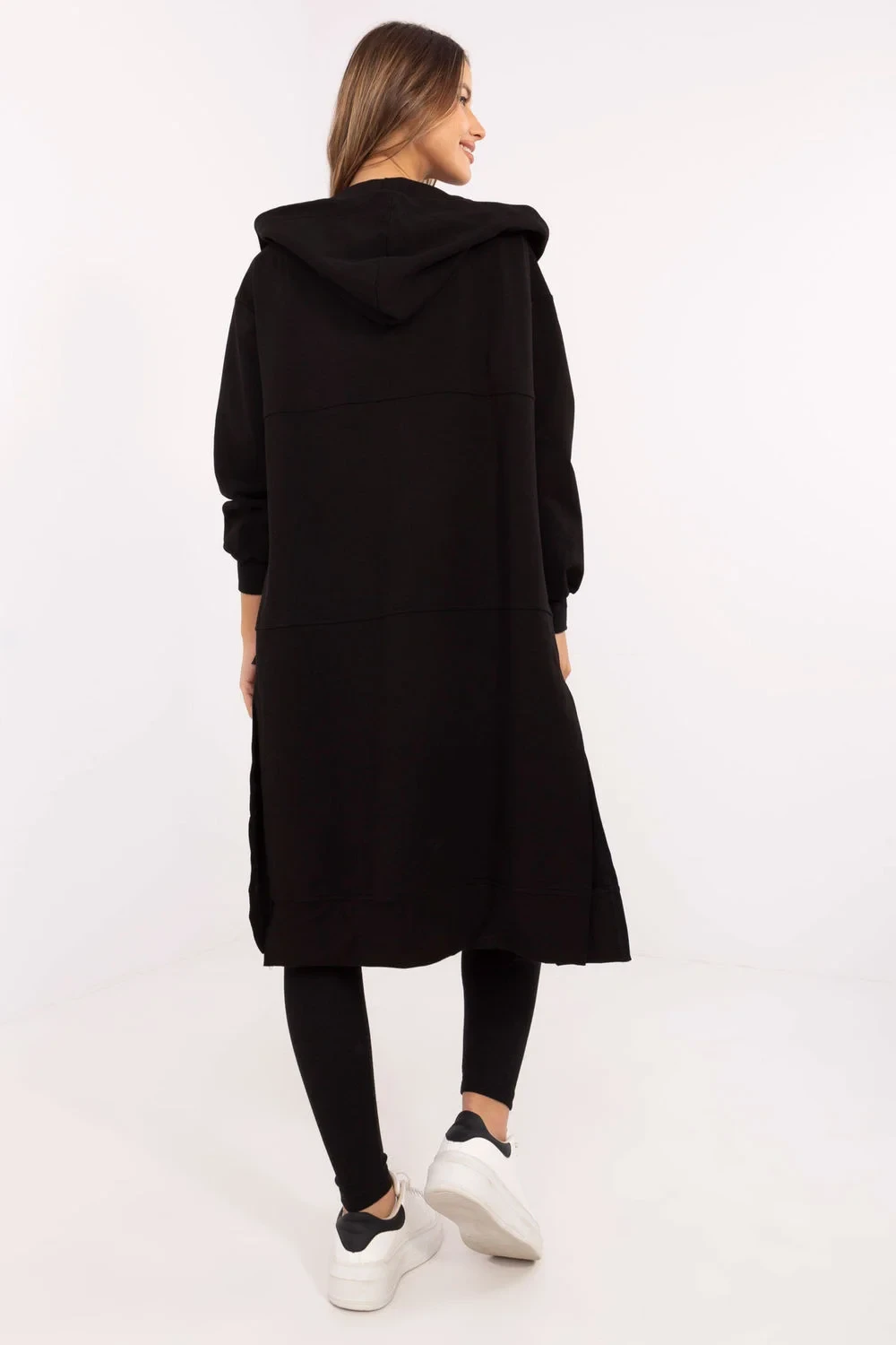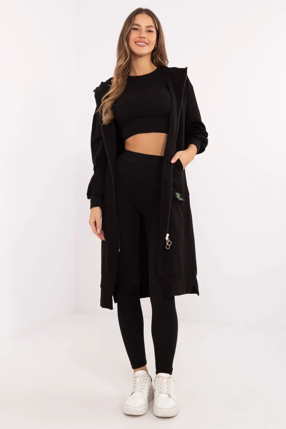 Dámský set skládající se z mikiny, topu a legín je harmonické spojení casual a sportovního stylu. Vytvořen s ohledem na každodenní pohodlí a aktivitu, skvěle poslouží jak při cvičení, tak při relaxaci. Mikina s prodlouženým střihem je praktickým řešením pro chladnější dny. Zapíná se na zip a je vybavena vloženými kapsami, což zajišťuje pohodlí a funkčnost. Vyrobena z směsi bavlny, polyesteru a elastanu, kombinuje měkkost s pružností. Dlouhý rukáv a kapuce navíc chrání před větrem a chladem. Top s kulatým výstřihem je jednoduchý a zároveň univerzální, ideálně padne ke kompletnímu setu. Jeho složení z bavlny a elastanu zaručuje prodyšnost a pohodlí nošení. Legíny se zužujícími se nohavicemi a vysokým pasem zdůrazňují postavu, zároveň poskytují plnou volnost pohybu. Vyrobena z bavlny a elastanu, vynikají pružností a odolností. Dalším výrazným prvkem je proužkovaná struktura materiálu, která jim dodává jedinečný charakter. Celkově drží v hladkém vzoru, skvěle zapadá do každodenního, sportovního looku, nabízí jak styl, tak maximální pohodlí užívání.