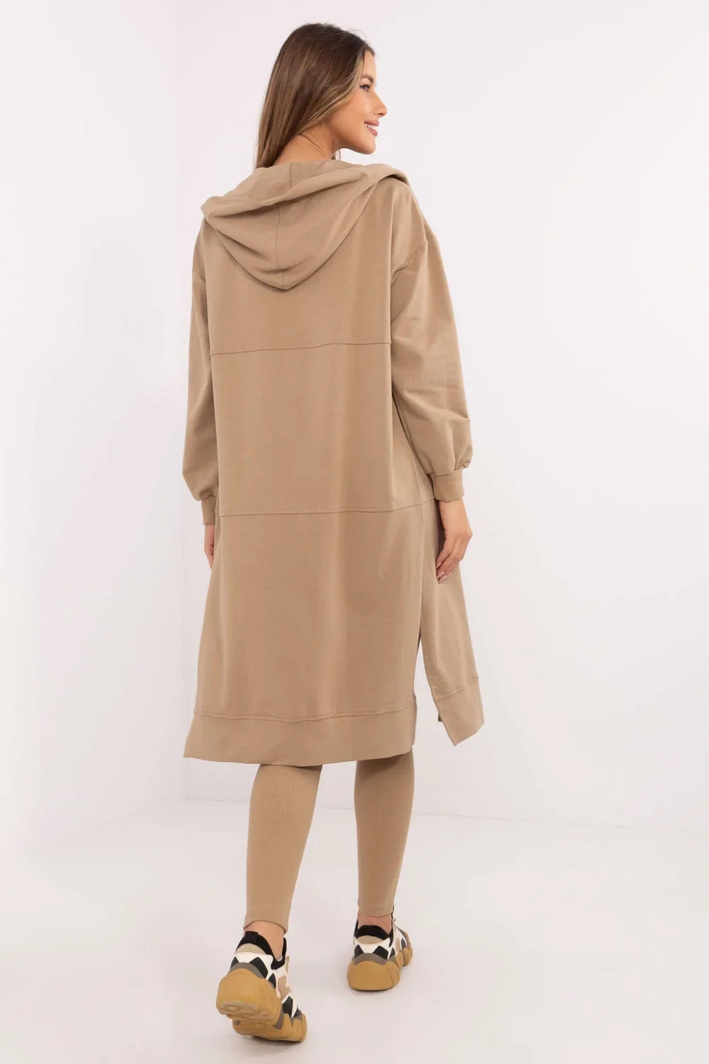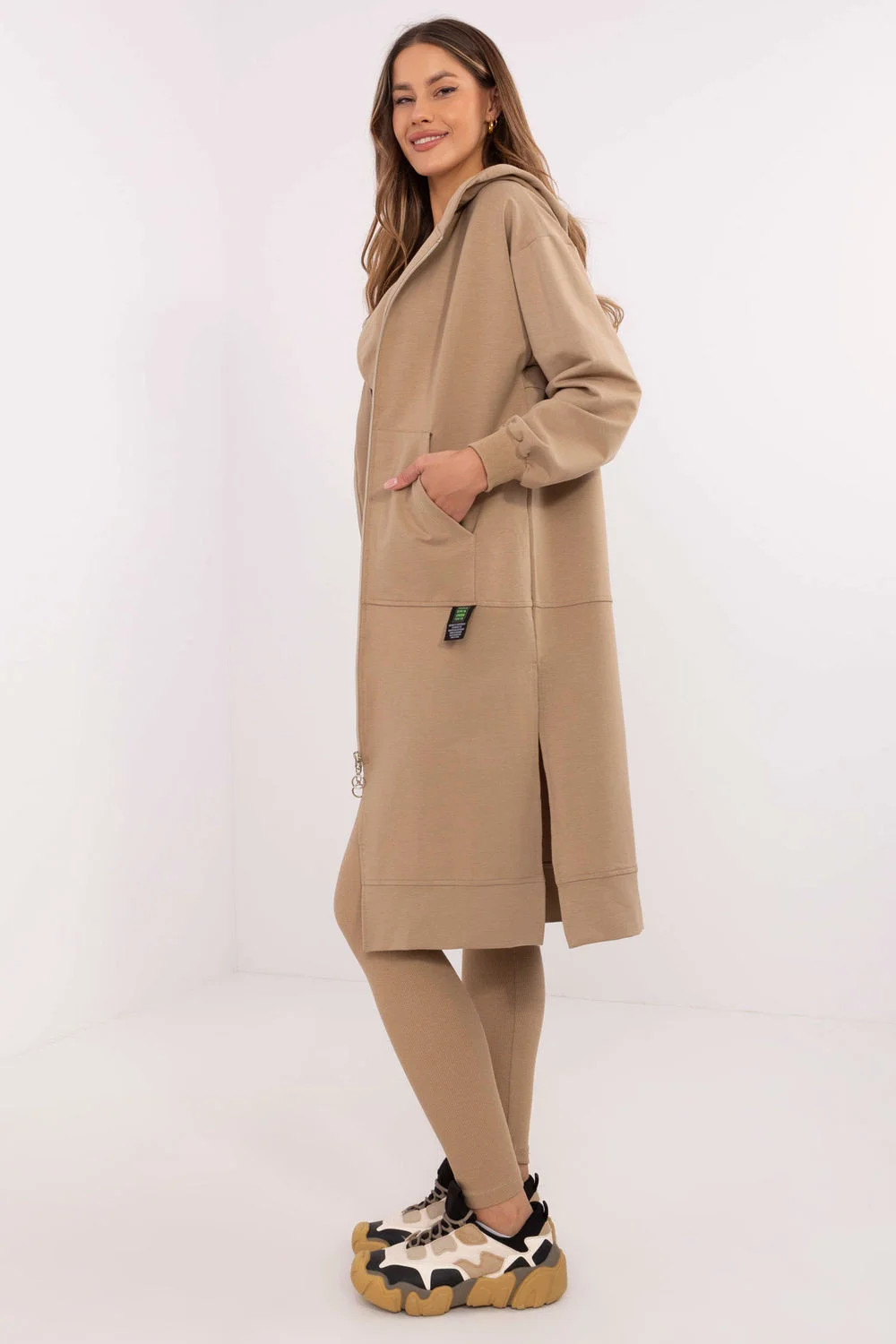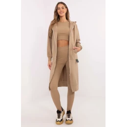 Dámský set skládající se z mikiny, topu a legín je harmonické spojení casual a sportovního stylu. Vytvořen s ohledem na každodenní pohodlí a aktivitu, skvěle poslouží jak při cvičení, tak při relaxaci. Mikina s prodlouženým střihem je praktickým řešením pro chladnější dny. Zapíná se na zip a je vybavena kapsami, což zajišťuje pohodlí a funkčnost. Vyrobená z kombinace bavlny, polyesteru a elastanu spojuje měkkost s pružností. Dlouhý rukáv a kapuce navíc chrání před větrem a chladem. Top s kulatým výstřihem je jednoduchý a zároveň univerzální, ideální pro celý set. Jeho složení z bavlny a elastanu zaručuje prodyšnost a pohodlí nošení. Legíny se zužujícími se nohavicemi a vysokým pasem zdůrazňují postavu a zároveň poskytují plnou volnost pohybu. Vyrobené z bavlny a elastanu jsou elastické a odolné. Dalším výrazným prvkem je proužkovaná struktura materiálu, která jim dodává jedinečný charakter. Celkově drženo v hladkém vzoru, skvěle zapadá do každodenního, sportovního vzhledu, nabízí styl i maximální pohodlí při nošení. Složení materiálu: Mikina: 72% bavlna, 22% polyester, 6% elastan Legíny a top: 90% bavlna, 10% elastan