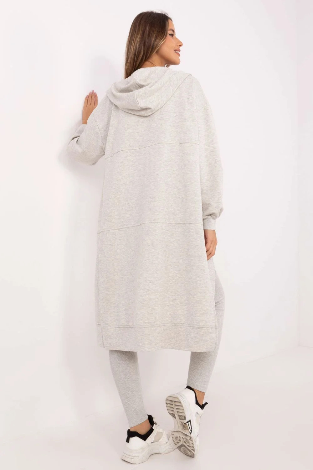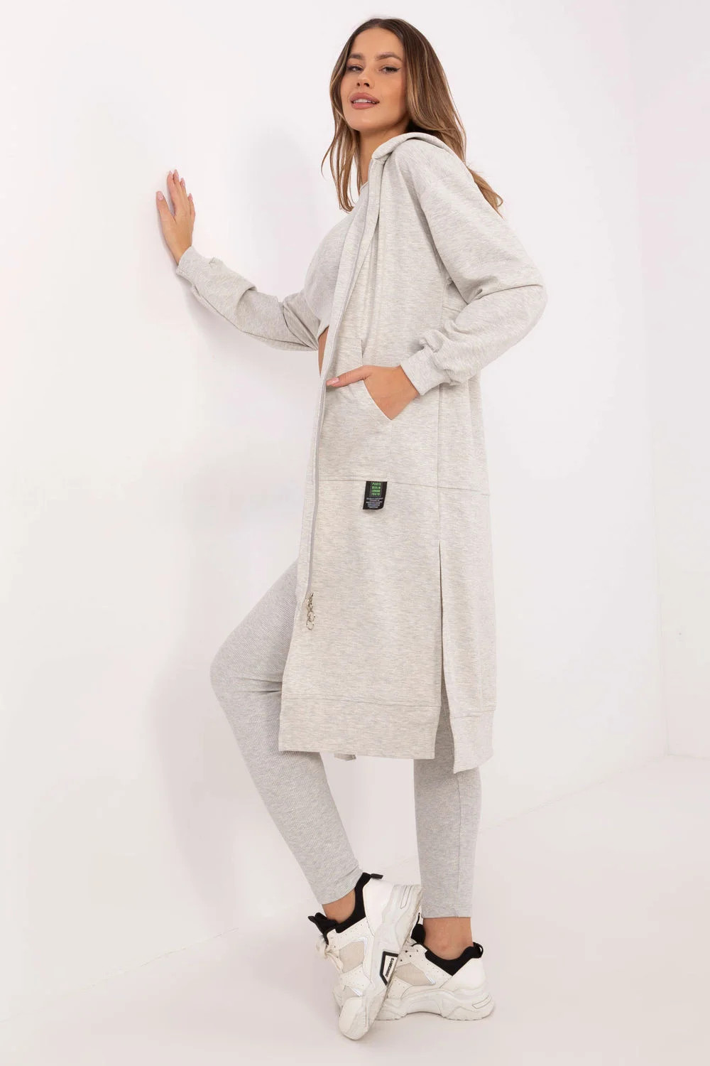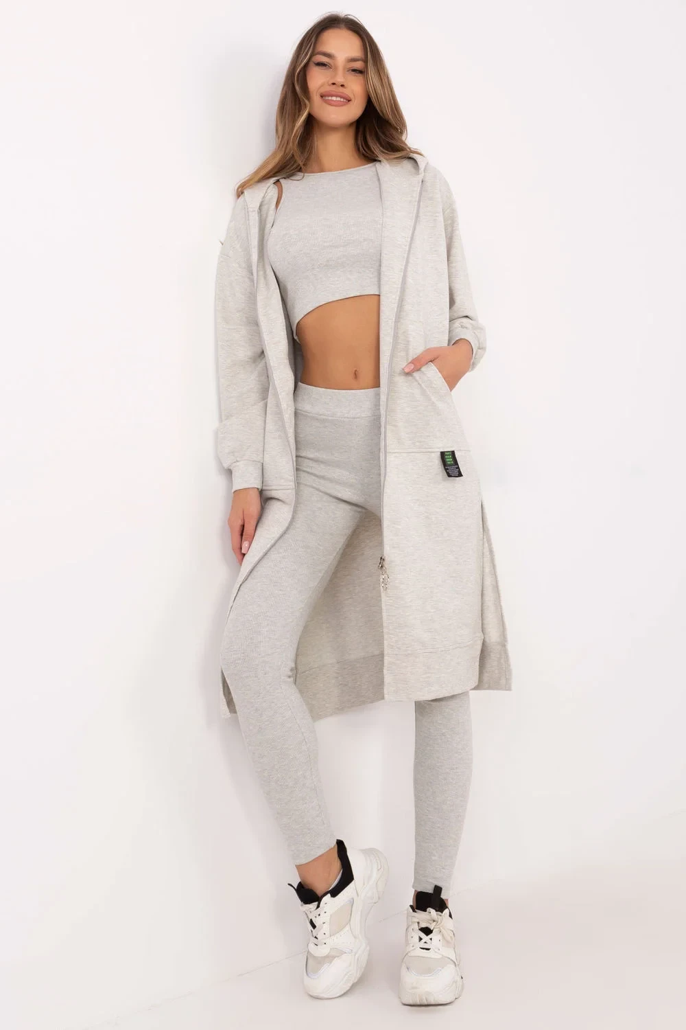 Dámský set skládající se z mikiny, topu a legín je harmonické spojení casualového a sportovního stylu. Vytvořen s ohledem na každodenní pohodlí a aktivitu, skvěle poslouží jak při cvičení, tak při relaxaci. Mikina s prodlouženým střihem je praktickým řešením pro chladnější dny. Zapíná se na zip a je vybavena kapsami, což zaručuje pohodlí a funkčnost. Vyrobená z kombinace bavlny, polyesteru a elastanu spojuje měkkost s pružností. Dlouhý rukáv a kapuce dodatečně chrání před větrem a chladem. Top s kulatým výstřihem je jednoduchý a zároveň univerzální, ideálně padnoucí k celému setu. Jeho složení z bavlny a elastanu zaručuje prodyšnost a pohodlí nošení. Legíny se zužujícími se nohavicemi a vysokým pasem zdůrazňují postavu, zároveň poskytují plnou volnost pohybu. Vyrobené z bavlny a elastanu, jsou elastické a odolné. Dalším výrazným prvkem je proužkovaná struktura materiálu, která jim dodává výjimečný charakter. Celý set v hladkém vzoru se skvěle hodí do každodenního, sportovního vzhledu, nabízí jak styl, tak maximální pohodlí při nošení.
