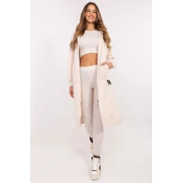 Dámský set skládající se z mikiny, topu a legín je harmonické spojení casual a sportovního stylu. Vytvořen s ohledem na každodenní pohodlí a aktivitu, skvěle poslouží jak při cvičení, tak při relaxaci. Mikina s prodlouženým střihem je praktickým řešením pro chladnější dny. Zapíná se na zip a je vybavena kapsami, co zajišťuje pohodlí a funkčnost. Vyrobená ze směsi bavlny, polyesteru a elastanu spojuje měkkost s pružností. Dlouhý rukáv a kapuce dále chrání před větrem a chladem. Top s kulatým výstřihem je jednoduchý a zároveň univerzální, ideální pro celý set. Jeho složení z bavlny a elastanu zaručuje prodyšnost a pohodlí nošení. Legíny se zužujícími se nohavicemi a vysokým pasem zdůrazňují postavu a zároveň poskytují plnou volnost pohybu. Vyrobené z bavlny a elastanu jsou elastické a odolné. Dalším rozlišovacím prvkem je proužkovaná struktura materiálu, která jim dodává výjimečný charakter. Celkově laděný v hladkém vzoru se skvěle hodí do každodenního sportovního vzhledu, nabízející jak styl, tak maximální pohodlí při nošení.