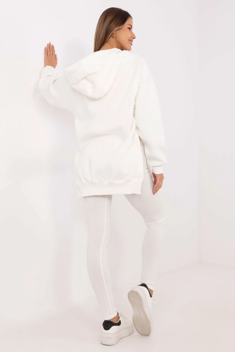 Dámský set skládající se z krátkého topu, dlouhé mikiny a legín je kombinací pohodlí a stylu, která se hodí do každodenních i sportovních outfitů. Udržován v casual a sportovním stylu, skvěle se hodí na procházku, trénink nebo relaxační den doma. Mikina s prodlouženým střihem je praktickým a módním prvkem setu. Vyrobená z teplé směsi bavlny a polyesteru, poskytuje teplo a pohodlí v chladnějších dnech. S prostornou kapucí, dlouhým rukávem a kapsou typu klokaní není jen funkční, ale i stylová. Výstřih ve tvaru písmene V jí dodává originální vzhled a nášivka na přední straně přidává charakteru. Top s klasickým, kulatým výstřihem je vyroben z bavlny s příměsí elastanu, což zaručuje pohodlí a dokonalé přizpůsobení tělu. Kratší střih zdůrazňuje siluetu, skvěle ladí s vysokým pasem legín. Legíny se zúženými nohavicemi a vysokým pasem zajišťují pohodlí a volnost pohybu. Jejich elastický materiál vyrobený z bavlny s přídavkem elastanu skvěle přiléhá k tělu. Pruhovaná struktura materiálu jim dodává jedinečný styl, podtrhuje moderní vzhled celého setu. Celková hladká vzorová struktura tvoří souvislý, moderní outfit, ideální pro aktivní ženy, které ocení jak pohodlí, tak módní design.