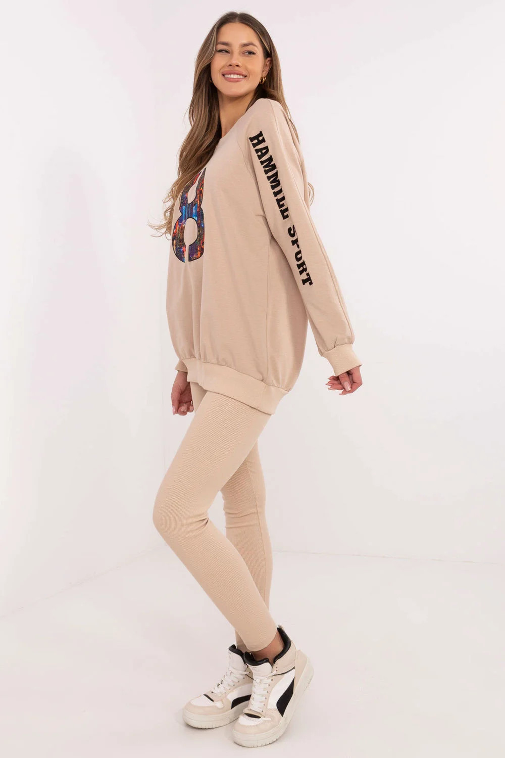 Dámský set skládající se z mikiny a legín je skvělým návrhem na každodenní, neformální stylizace. Ideální pro ženy, které ocení pohodlí a zároveň chtějí vypadat módně a stylově. Mikina klasického střihu s kulatým výstřihem a dlouhým rukávem je vyrobena z vysoce kvalitní směsi bavlny, polyesteru a elastanu. Je příjemná na dotek, elastická a odolná, což zajišťuje pohodlí při nošení po celý den. Subtilní nášivky a vyšívání na rukávu a přední části jí dodávají zvláštní charakter, zdůrazňující moderní design. Legíny se zúženými nohavicemi a vysokým pasem jsou ideálním doplňkem k setu. Vyrobené z bavlny s příměsí elastanu se perfektně přizpůsobují postavě, poskytují plnou volnost pohybu a pohodlí. Celý set je v hladkém vzoru, což ho činí univerzálním a snadno kombinovatelným s různými doplňky. Skvělá volba na každodenní vycházky, relaxaci nebo aktivity v uvolněném stylu. Složení materiálu: Mikina: 72 % bavlna, 22 % polyester, 6 % elastan Legíny: 90 % bavlna, 10 % elastan