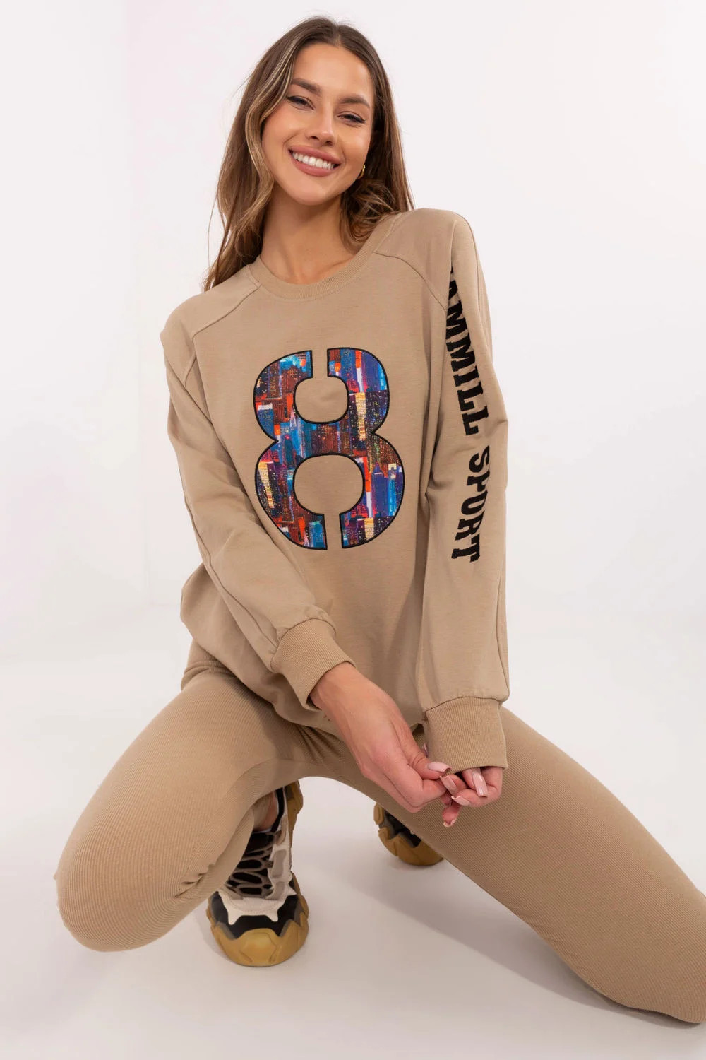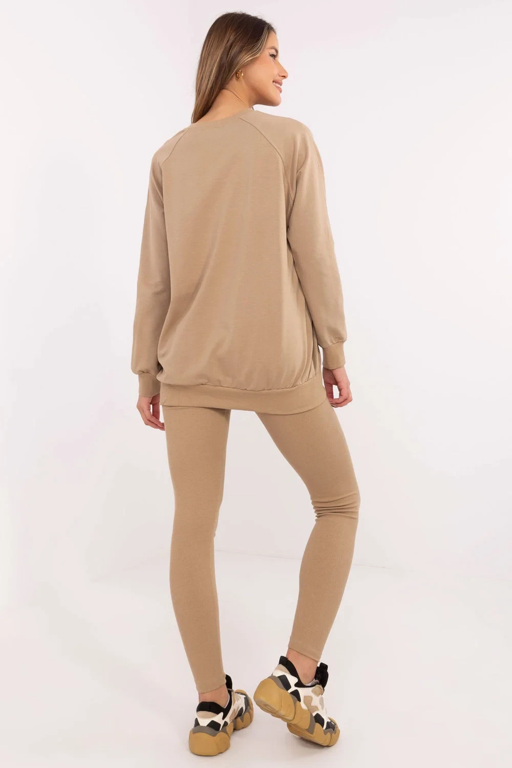 Dámský set skládající se z mikiny a legín je skvělý návrh na každodenní, ležérní stylizace. Ideální pro ženy, které ocení pohodlí a zároveň chtějí vypadat módně a stylově. Mikina s klasickým střihem, kulatým výstřihem a dlouhým rukávem je vyrobena z vysoce kvalitní směsi bavlny, polyesteru a elastanu. Je příjemná na dotek, elastická a odolná, což zajišťuje pohodlí během celého dne. Jemné nášivky a vyšívání na rukávu a přední části dodávají mikině jedinečný charakter, zdůrazňují moderní design. Legíny se stočenými nohavicemi a vysokým pasem jsou ideálním doplňkem k setu. Vyrobena z bavlny s příměsí elastanu, skvěle se přizpůsobují postavě, poskytují plnou volnost pohybu a pohodlí. Celý set v hladkém vzoru, což ho činí univerzálním a snadno kombinovatelným s různými doplňky. Jedná se o perfektní volbu pro každodenní vycházky, relaxaci nebo aktivity v uvolněném stylu.