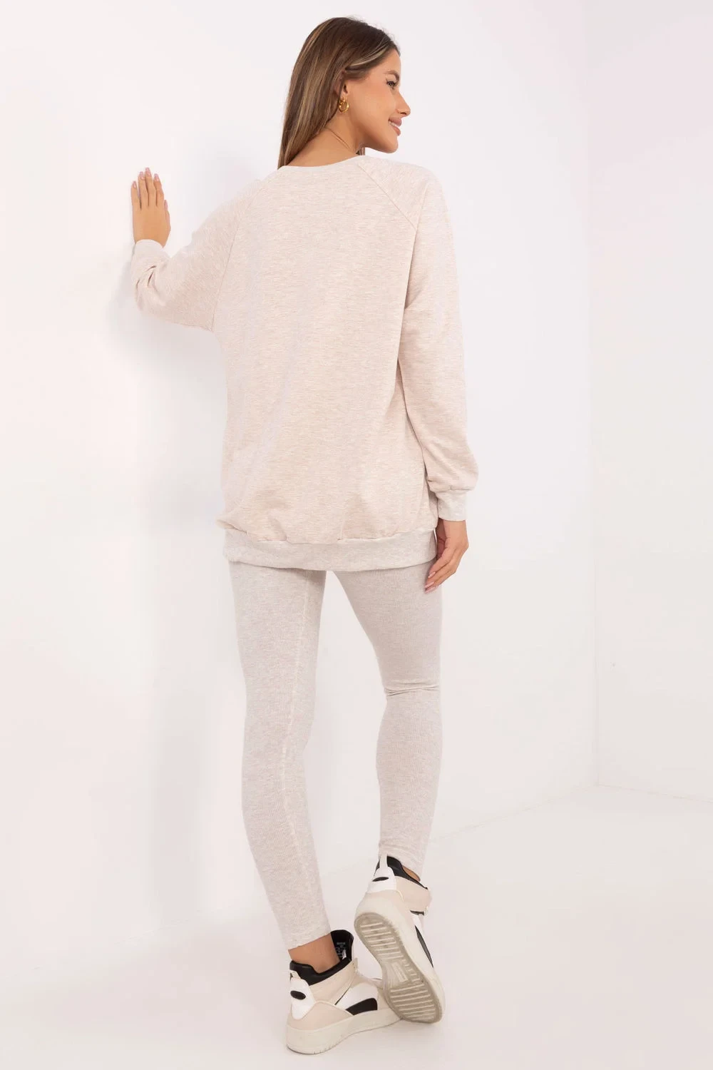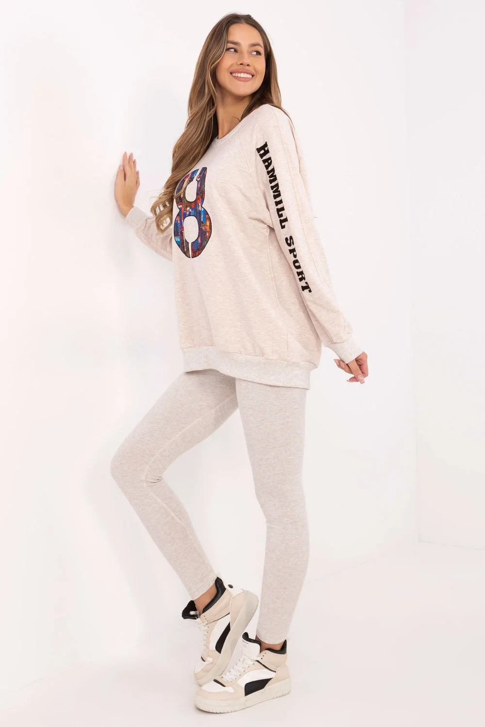 Dámský set skládající se z mikiny a legín je skvělou nabídkou pro každodenní, casual stylizace. Ideální pro ženy, které ocení pohodlí a zároveň chtějí vypadat módně a stylově. Mikina v klasickém střihu s kulatým výstřihem a dlouhým rukávem je vyrobena z vysoce kvalitní směsi bavlny, polyesteru a elastanu. Je příjemná na dotek, elastická a odolná, což zajišťuje pohodlí po celý den. Jemné nášivky a vyšívané detaily na rukávu a přední části dodávají mikině výjimečný charakter a zdůrazňují moderní design. Legíny se zúženými nohavicemi a vysokým pasem jsou ideálním doplňkem sady. Vyrobena z bavlny s příměsí elastanu, perfektně padnou ke figuře, poskytují plnou volnost pohybu a pohodlí. Celkový jednobarevný vzor dělá set univerzálním a snadno kombinovatelným s různými doplňky. Je to perfektní volba pro každodenní vycházky, relaxaci nebo volnočasové aktivity v uvolněném stylu. Složení materiálu: Mikina: 72% bavlna, 22% polyester, 6% elastan Legíny: 90% bavlna, 10% elastan
