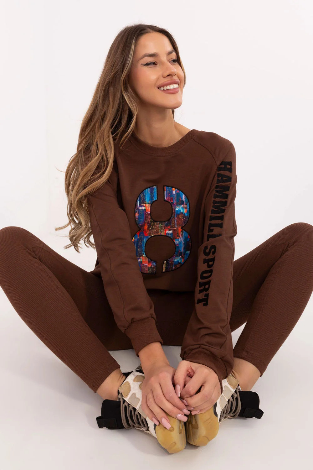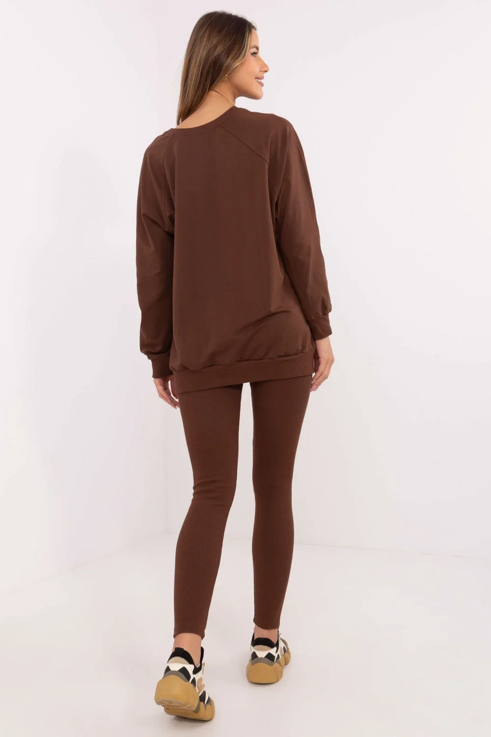 Dámský set skládající se z mikiny a legín je skvělým návrhem pro každodenní, ležérní styling. Ideální pro ženy, které ocení pohodlí a zároveň chtějí vypadat módně a stylově. Mikina s klasickým střihem s kulatým výstřihem a dlouhým rukávem je vyrobena z vysoce kvalitní směsi bavlny, polyesteru a elastanu. Je příjemná na dotek, elastická a odolná, což zaručuje pohodlí po celý den. Subtílní potisky a vyšívání na rukávu a přední straně dodávají mikině jedinečný charakter, zdůrazňující moderní design. Legíny s úzkými nohavicemi a vysokým pasem jsou ideálním doplňkem k setu. Vyrobene z bavlny s příměsí elastanu, skvěle padnou k postavě, poskytují plnou volnost pohybu a pohodlí. Celý set je v hladkém vzoru, což ho činí univerzálním a snadno kombinovatelným s různými doplňky. Je to perfektní volba pro každodenní vycházky, relaxaci nebo aktivity v uvolněném stylu. Složení materiálu: Mikina: 72% bavlna, 22% polyester, 6% elastan Legíny: 90% bavlna, 10% elastan