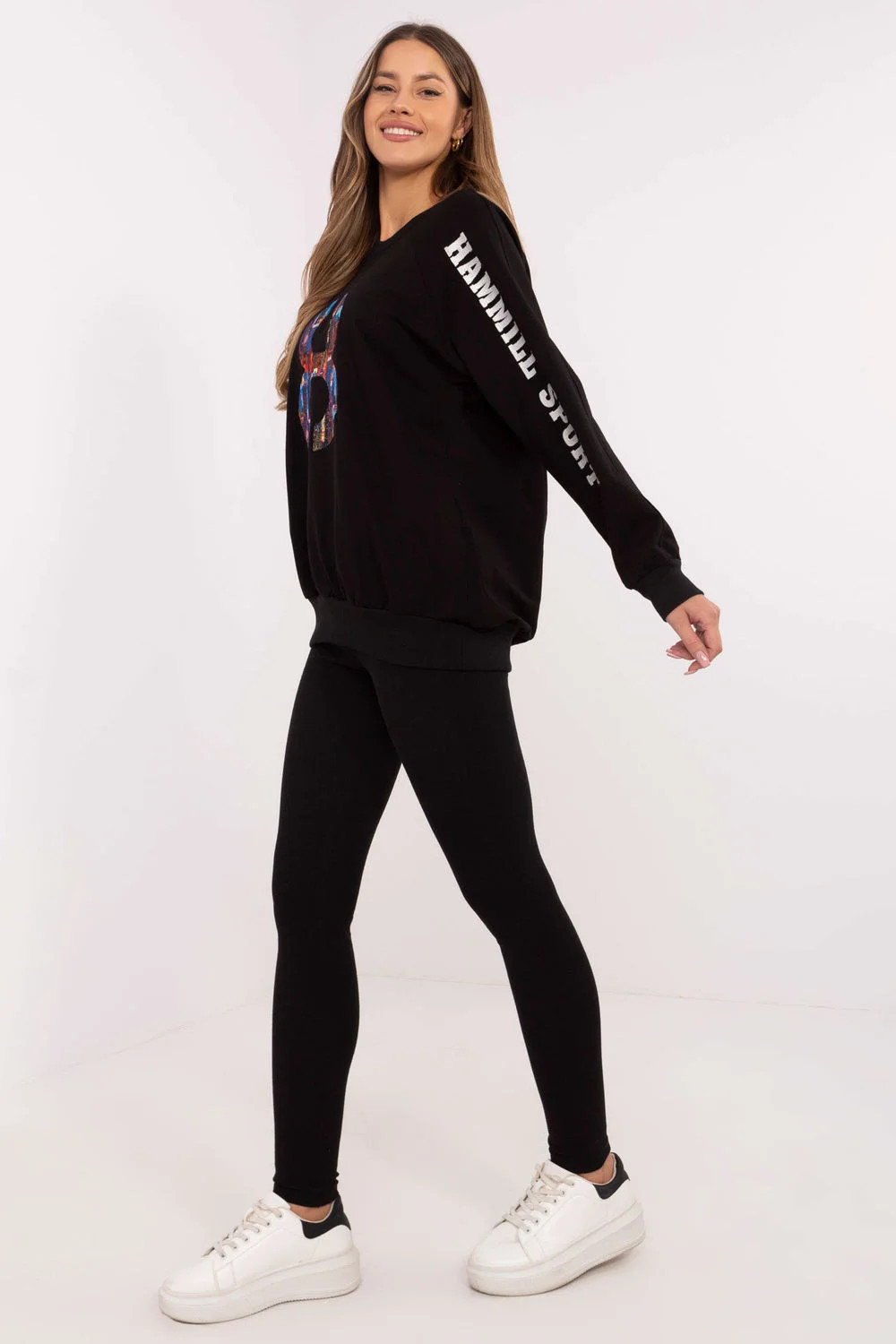 Dámský set skládající se z mikiny a legín je skvělý návrh pro každodenní, ležérní stylizace. Ideální pro ženy, které ocení pohodlí a zároveň chtějí vypadat módně a stylově. Mikina s klasickým střihem s kulatým výstřihem a dlouhým rukávem je vyrobena z vysoce kvalitní směsi bavlny, polyesteru a elastanu. Je příjemná na dotek, elastická a odolná, což zaručuje pohodlí během celého dne. Jemné aplikace a vyšívání na rukávu a přední části jí dodávají výjimečný charakter, zdůrazňující moderní design. Legíny s sevřenými nohavicemi a vysokým pasem jsou ideálním doplňkem setu. Vyrobena z bavlny s příměsí elastanu se perfektně přizpůsobí postavě, poskytující plnou volnost pohybu a pohodlí. Celkový vzhled je udržován v hladkém vzoru, což činí set univerzálním a snadno kombinovatelným s různými doplňky. Je to dokonalá volba na každodenní vycházky, relaxaci nebo aktivity v uvolněném stylu. Složení materiálu: Mikina: 72% bavlna, 22% polyester, 6% elastan Legíny: 90% bavlna, 10% elastan