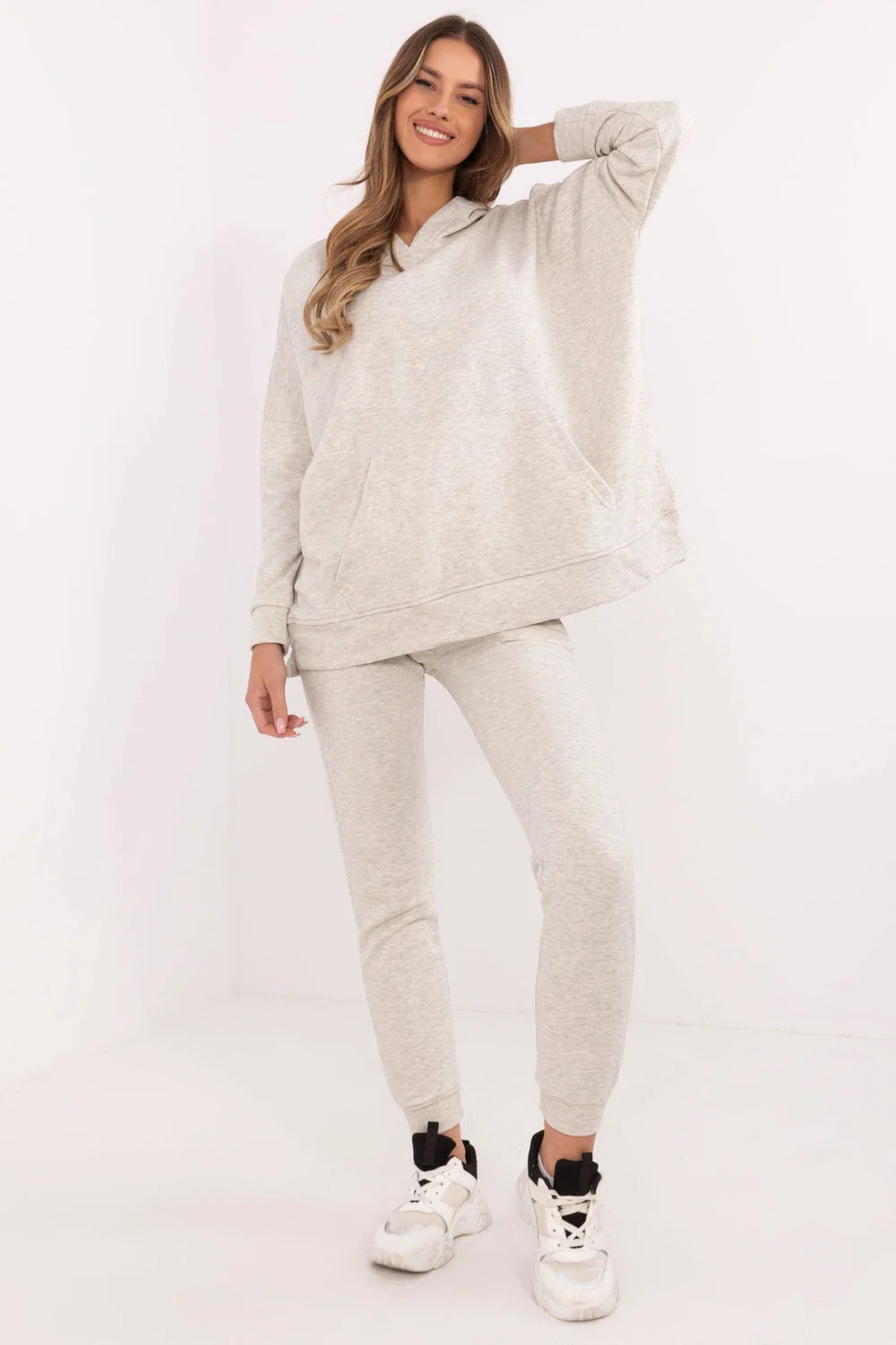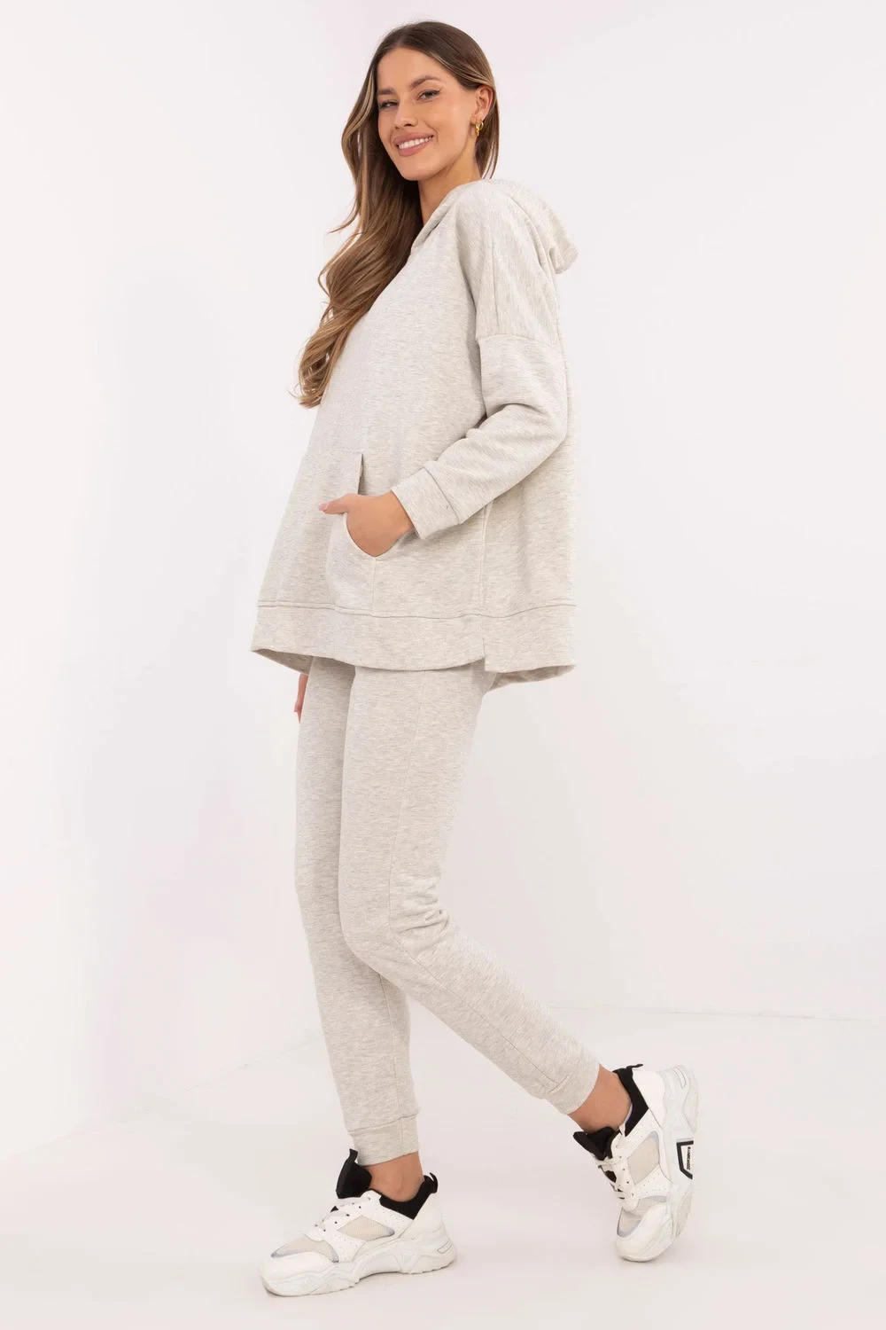 Dámský teplákový set je perfektní kombinací pohodlí a stylu, ideální pro každodenní aktivity. Vyrobený z měkké směsi bavlny a polyesteru, zajistí pohodlí nošení a odolnost materiálu. Mikina má klasický, ležérní střih s dlouhými rukávy zakončenými manžetami. Na přední straně je praktická kapsa typu klokánek, která dodává sportovní charakter a je ideální pro uložení drobností. Hladký vzor mikiny ji činí univerzální a snadnou k stylizaci na každý den. Kalhoty se vyznačují vysokým pasem, který zdůrazňuje postavu, a nohavicemi zakončenými manžetami pro ideální přizpůsobení. Boční kapsy jsou praktickým prvkem, který zvyšuje funkcionalitu kalhot. Tento set je skvělou volbou pro ženy, které ocení pohodlí a stylový vzhled na každý den. Hladká struktura a decentní design dělají tento set vhodným na každou příležitost v ležérním stylu.