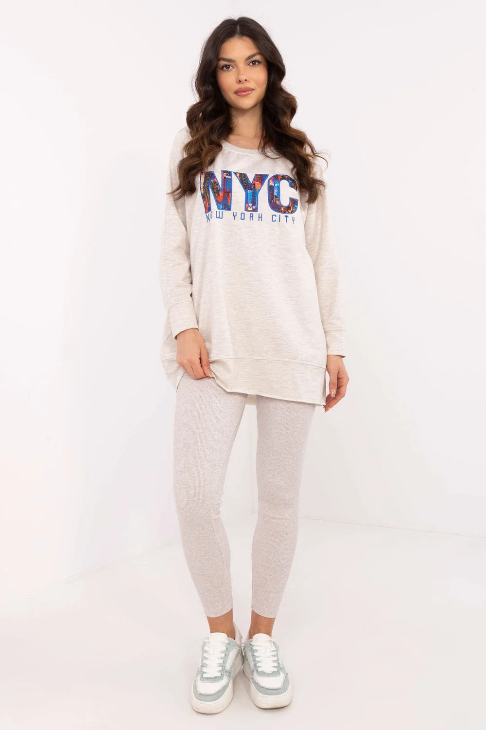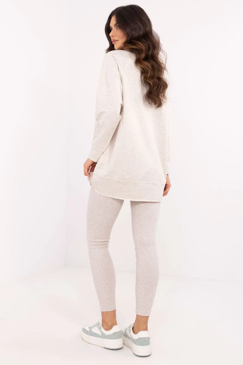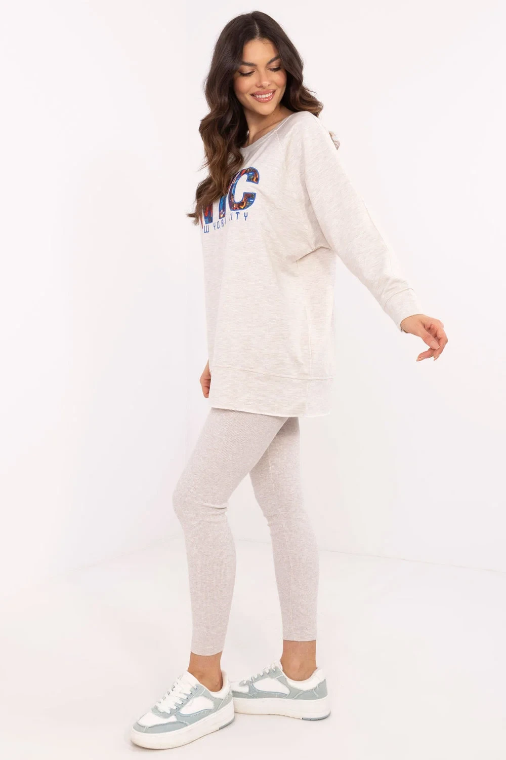 Dámská souprava sestávající z mikiny a legín je dokonalou kombinací pohodlí a stylu. Mikina má na přední straně potisk, který jí dodává jedinečný charakter a podtrhuje moderní design. Je vyrobena ze směsi vysoce kvalitní bavlny, polyesteru a elastanu, takže poskytuje pohodlí a odolnost. Legíny se vyznačují vysokým pasem, který dokonale zvýrazňuje pas a zajišťuje pohodlí při každodenních aktivitách. Zúžené nohavice dokonale padnou, zatímco žebrovaná tkanina dodává jemnou strukturu a módní vzhled. Souprava je ideální pro každodenní výlety, procházky nebo chvíle odpočinku doma. Díky kombinaci univerzálního stylu a funkčnosti je skvělou volbou pro všechna roční období.
