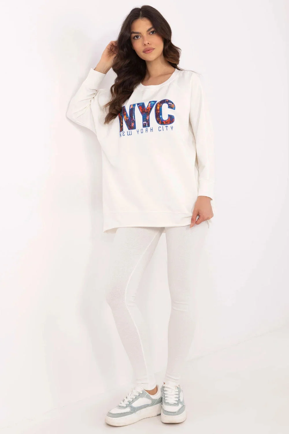 Dámská souprava sestávající z mikiny a legín je dokonalou kombinací pohodlí a stylu. Mikina má na přední straně potisk, který jí dodává jedinečný charakter a podtrhuje moderní design. Je vyrobena ze směsi vysoce kvalitní bavlny, polyesteru a elastanu, takže poskytuje pohodlí a odolnost. Legíny se vyznačují vysokým pasem, který dokonale zvýrazňuje pas a zajišťuje pohodlí při každodenních aktivitách. Zúžené nohavice dokonale padnou, zatímco žebrovaná tkanina dodává jemnou strukturu a módní vzhled. Souprava je ideální pro každodenní výlety, procházky nebo chvíle odpočinku doma. Díky kombinaci univerzálního stylu a funkčnosti je skvělou volbou pro všechna roční období.