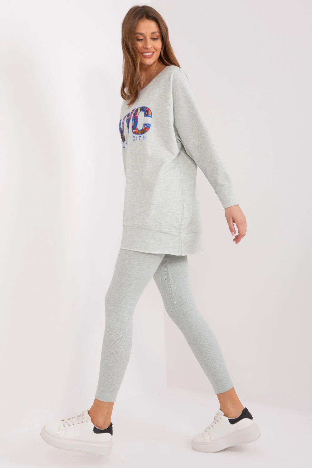 Dámská souprava sestávající z mikiny a legín je dokonalou kombinací pohodlí a stylu. Mikina má na přední straně potisk, který jí dodává jedinečný charakter a podtrhuje moderní design. Je vyrobena ze směsi vysoce kvalitní bavlny, polyesteru a elastanu, takže poskytuje pohodlí a odolnost. Legíny se vyznačují vysokým pasem, který dokonale zvýrazňuje pas a zajišťuje pohodlí při každodenních aktivitách. Zúžené nohavice dokonale padnou, zatímco žebrovaná tkanina dodává jemnou strukturu a módní vzhled. Souprava je ideální pro každodenní výlety, procházky nebo chvíle odpočinku doma. Díky kombinaci univerzálního stylu a funkčnosti je skvělou volbou pro všechna roční období.