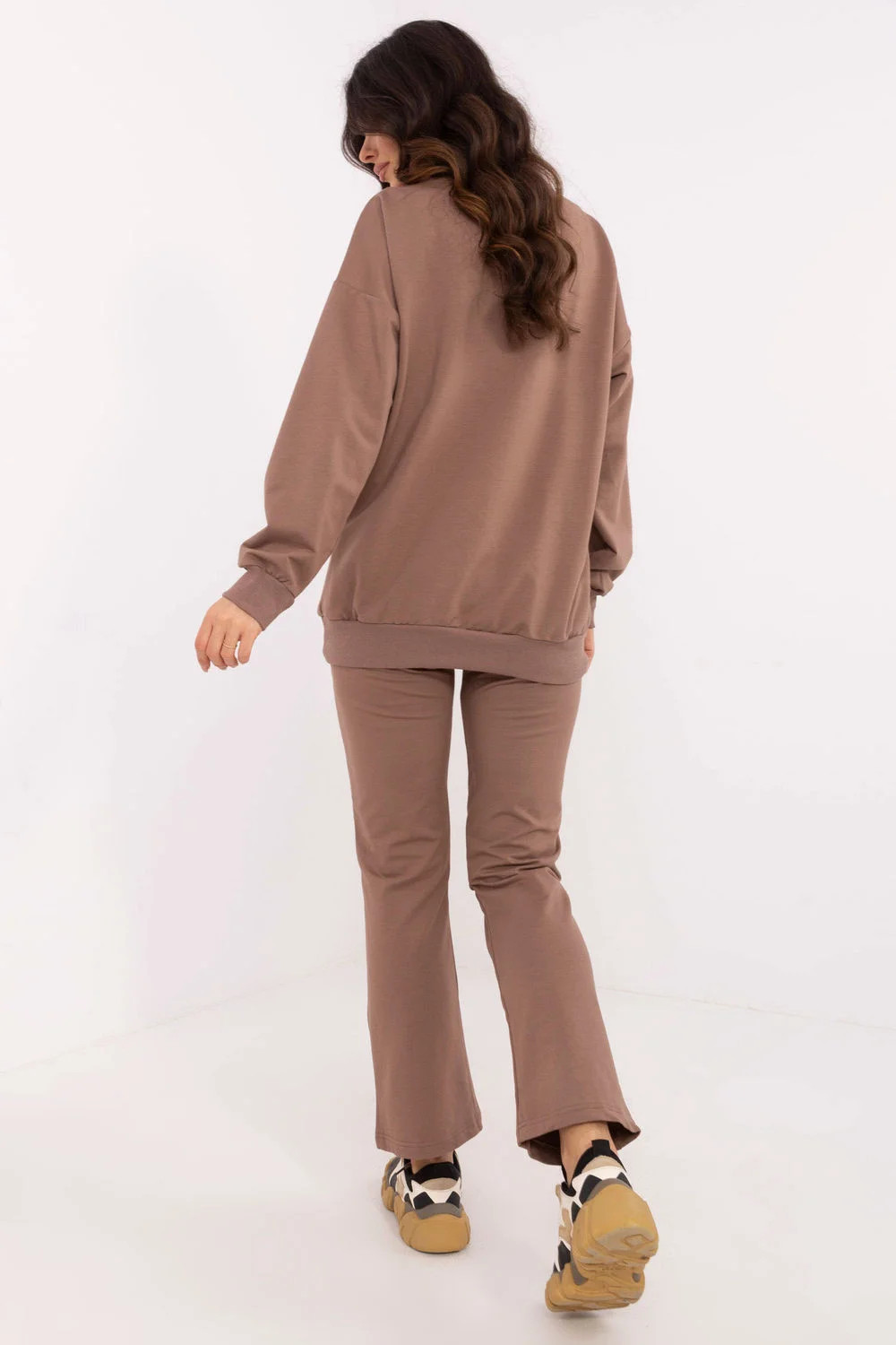 Tento dámský set je ideální volbou na každý den, kombinuje pohodlí s minimalistickým stylem. Skládá se z mikiny s dlouhým rukávem a klopovým výstřihem do V, který dodává celku ženský akcent. Jemná nášivka na mikině je módním detail, který přitahuje pozornost. Kalhoty s rovným střihem, vysokým pasem a širokou gumou v pase, zaručují perfektní sedění a pohodlí nošení. Vsazené boční kapsy nejsou jen praktické, ale také zdůrazňují volný charakter setu. Celý kousek je vyroben z měkké směsi bavlny, elastanu a polyesteru, což zaručuje pohodlí a odolnost. Set se skvěle hodí na procházky, nákupy nebo relaxaci doma a jeho univerzální design umožňuje snadné přizpůsobení různým příležitostem.