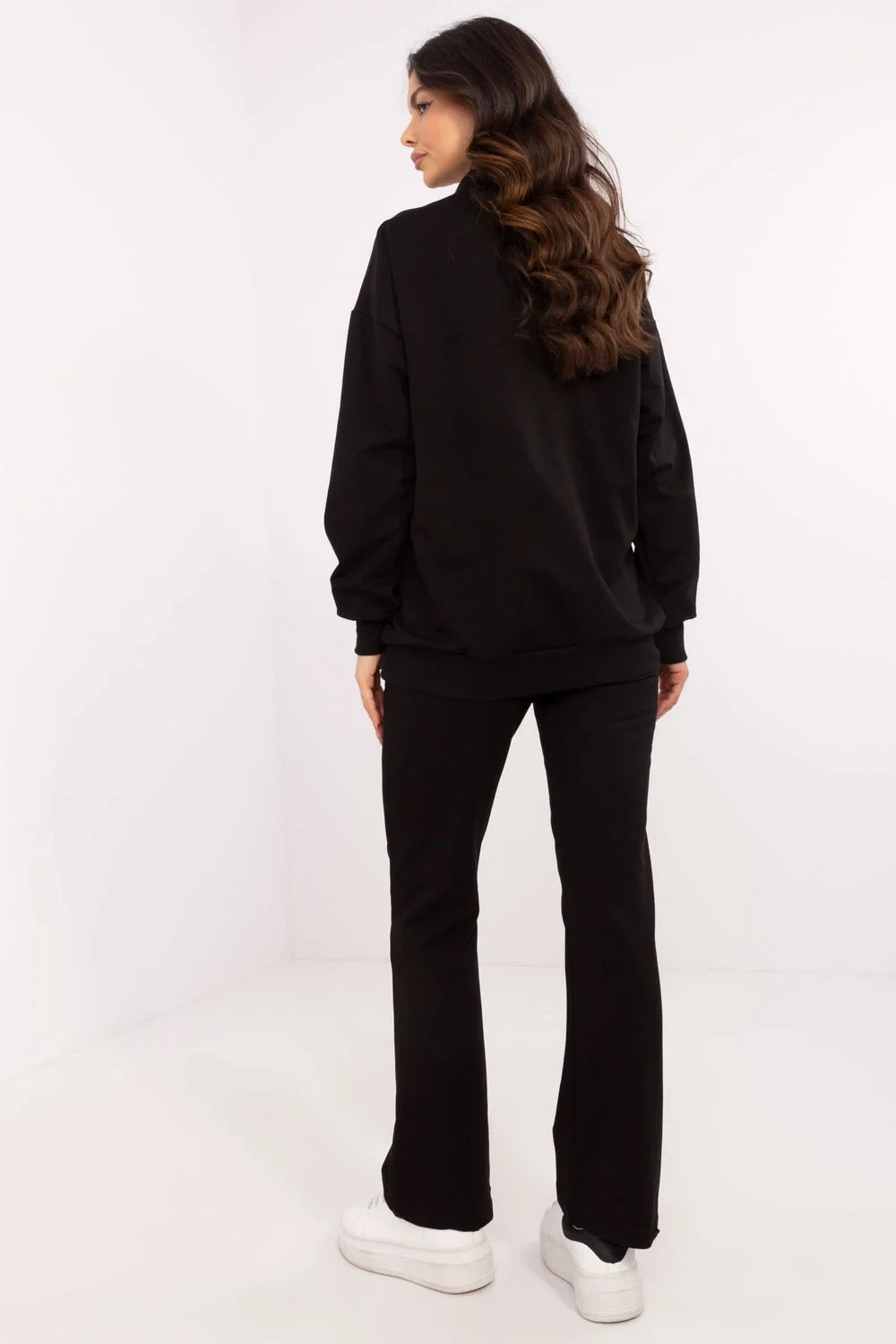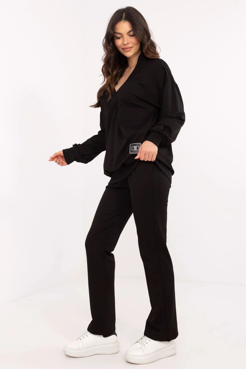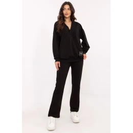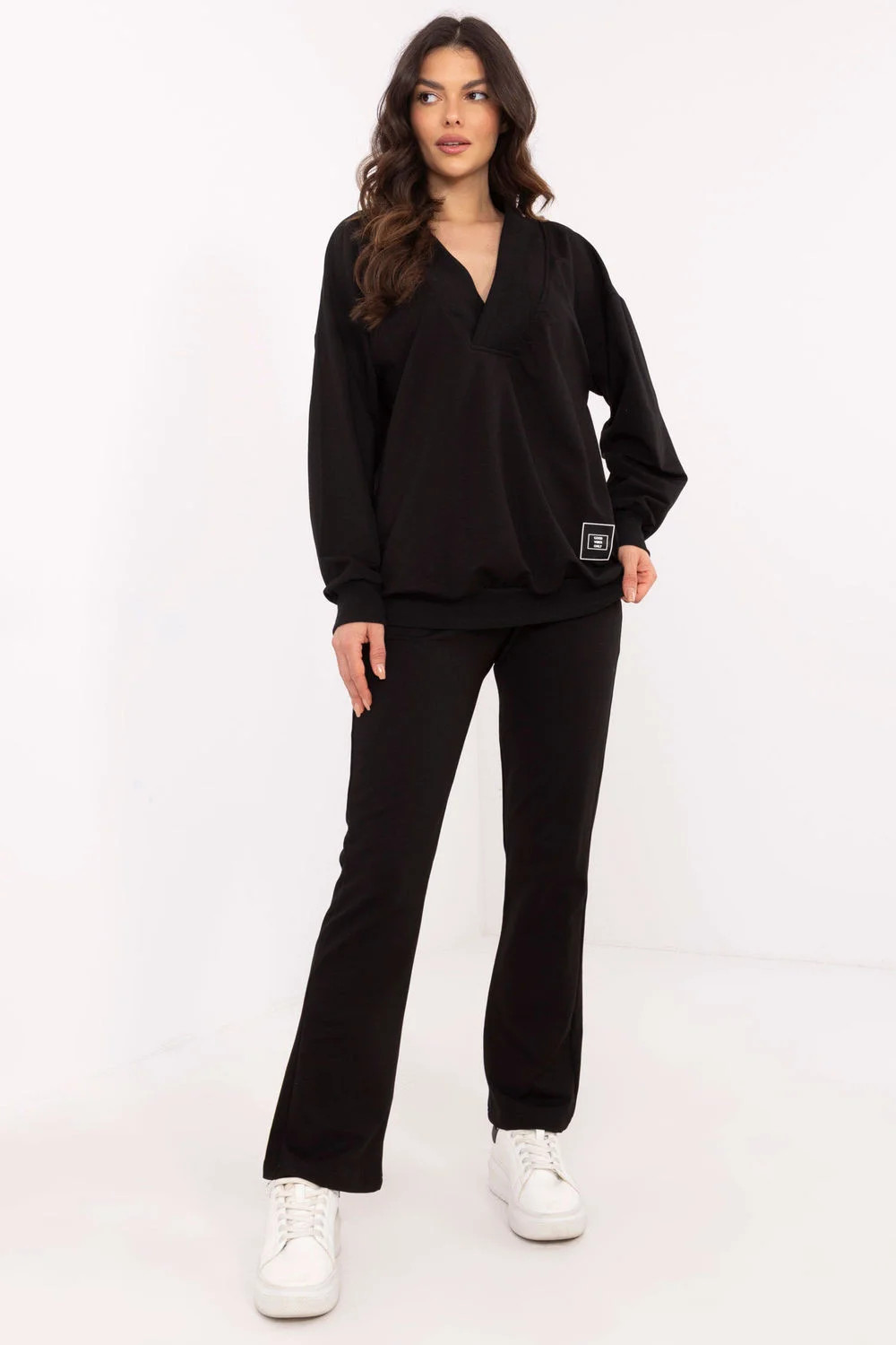 Tento dámský set je ideální volbou na každý den, kombinující pohodlí s minimalistickým stylem. Skládá se z mikiny s dlouhým rukávem a klopovým výstřihem do V, který dodává celku ženský akcent. Jemné nášivka na mikině představuje módní detail, který přitahuje pozornost. Kalhoty s přímým střihem, vysokým pasem a širokým elastickým pásem zajišťují perfektní přizpůsobení a pohodlí při nošení. Postranní kapsy jsou nejen praktické, ale také zdůrazňují volný charakter setu. Celý set je vyroben z měkké směsi bavlny, elastanu a polyesteru, což zaručuje pohodlí a odolnost. Set se skvěle hodí na procházky, nákupy nebo odpočinek doma, a jeho univerzální design umožňuje snadné přizpůsobení různým příležitostem.