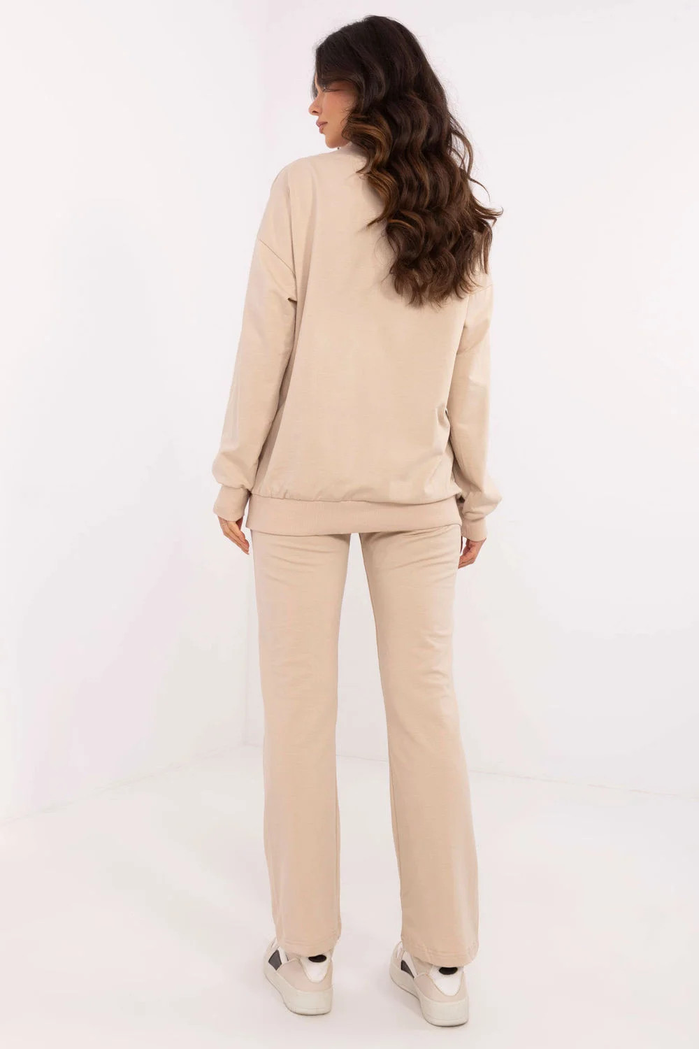 Tento dámský komplet je ideální volbou na každý den, kombinuje pohodlí s minimalistickým stylem. Skládá se z mikiny s dlouhým rukávem a přesýpacím výstřihem do srdce, který dodává celku ženský akcent. Jemná nášivka na mikině je módním detail, který přitahuje pozornost. Kalhoty s jednoduchým střihem, vysokým pasem a širokou gumou v pase zajišťují skvělé přizpůsobení a pohodlí nošení. Vložené boční kapsy nejsou jen praktické, ale také zdůrazňují volný charakter kompletu. Celý kus je vyrobený z měkké směsi bavlny, elastanu a polyesteru, což zaručuje pohodlí a odolnost. Komplet se skvěle hodí na procházky, nákupy nebo relaxaci doma a jeho univerzální design umožňuje snadné sladění s různými příležitostmi.