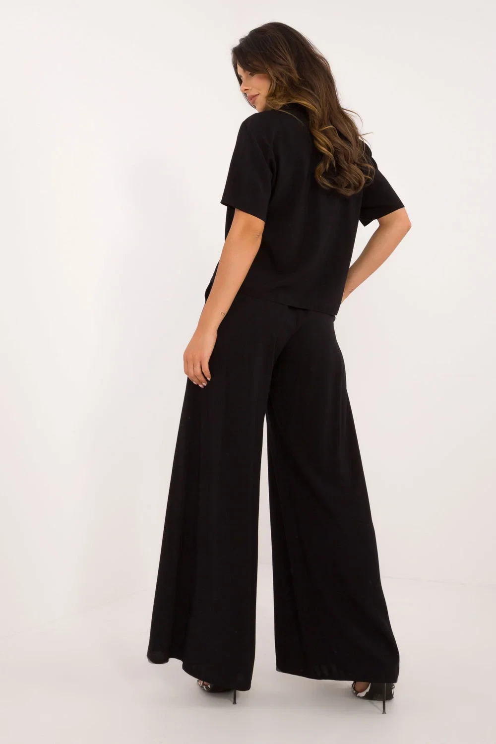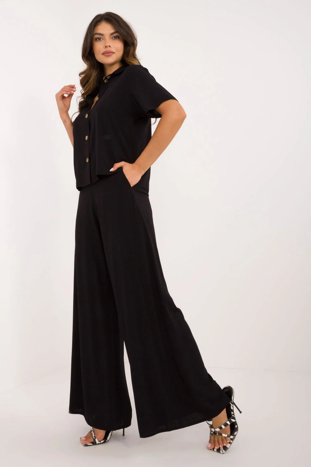 Elegantní a pohodlný set, který skvěle kombinuje volný styl s nádechem elegance. Vyrobený z lehké a prodyšné viskózy, poskytuje pohodlí po celý den, ideální pro každodenní nošení i do práce. Košile s klasickým střihem má krátký rukáv, límeček a zapínání na knoflíky, co jí dodává nadčasový charakter. Široké kalhoty s vysokým pasem krásně zdůrazňují postavu, a skrytý zip na boku zajišťuje estetické zakončení a pohodlné padnutí. Vsuvné boční kapsy přidávají funkčnost a volný charakter. Hladký vzor a minimalistický design umožňují snadné doplnění různými doplňky, vytvářející stylové kombinace na různé příležitosti. Ideální volba pro ženy, které oceňují pohodlí a nadčasový styl!