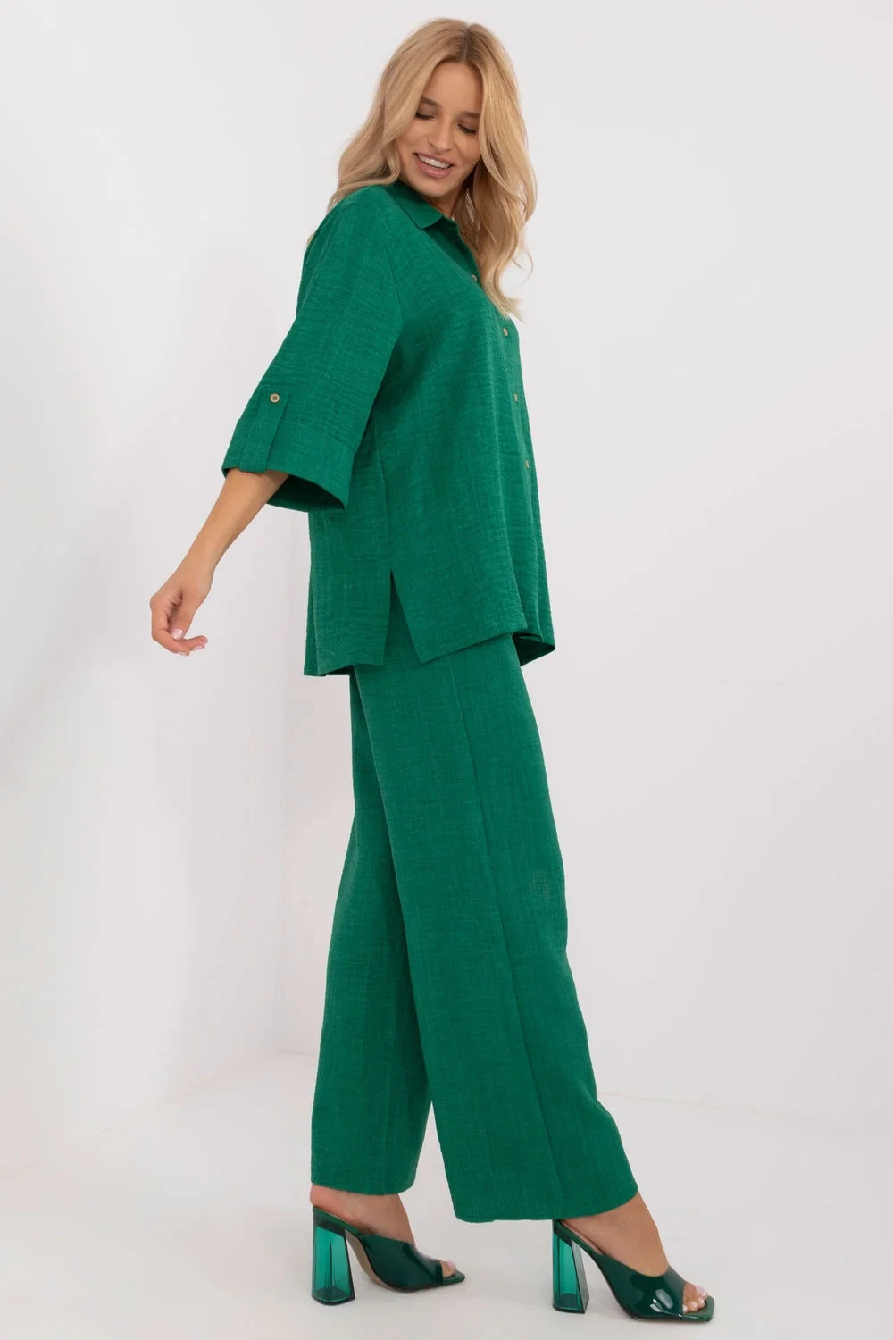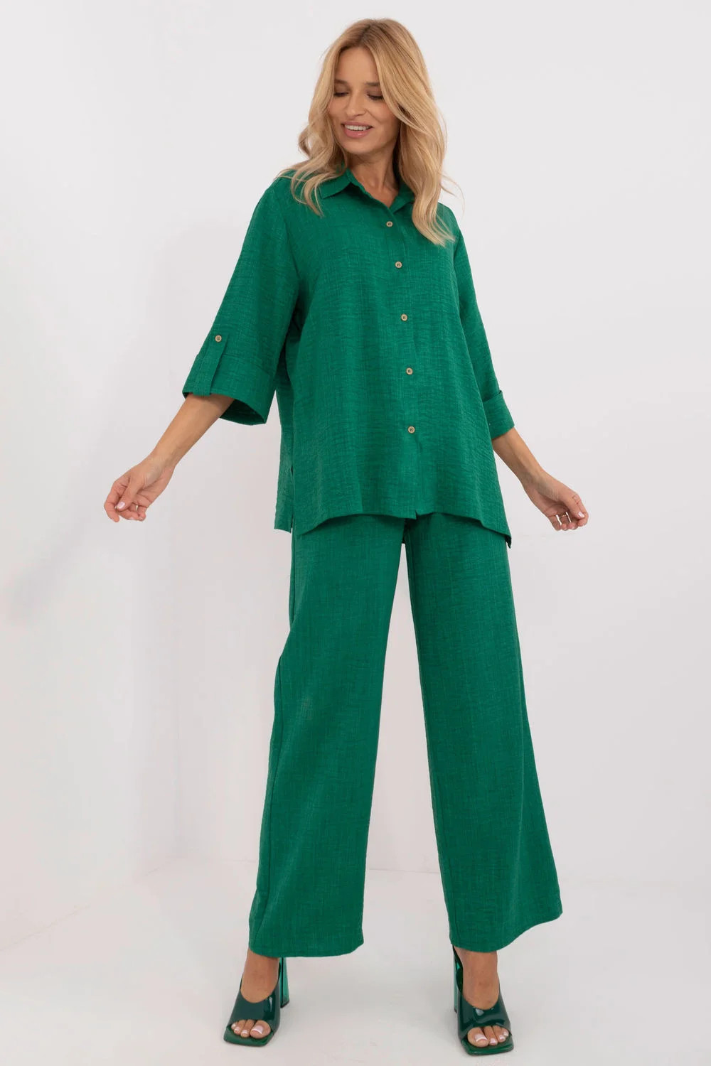 Elegantní a pohodlný set, ideální na každý den pro ženy, které ocení pohodlí a elegantní casualový vzhled. Vyrobený z vysoce kvalitní směsi bavlny a polyesteru, poskytuje prodyšnost, měkkost a pohodlí po celý den. Košile klasického střihu s límcem a 3/4 rukávem se zapínáním na knoflíky jí dodává nadčasový charakter. Široké kalhoty s vysokým pasem krásně zdůrazňují siluetu a pásek umožňuje ideální přizpůsobení postavě. Vložené boční kapsy dodávají praktičnost a volný vzhled. Hladký vzor a minimalistický design umožňují snadné kombinování setu s různými doplňky, vytvářející stylové outfit na mnoho příležitostí. Skvělá volba pro ženy, které si oblíbily spojení pohodlí a módního vzhledu!