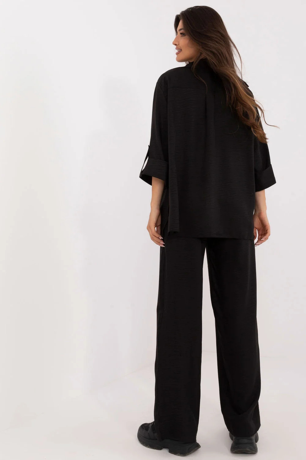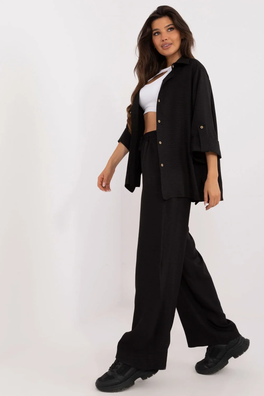 Elegantní a pohodlná sada, ideální na každý den pro ženy, které oceňují pohodlí a elegantní casual vzhled. Vyrobená z vysoké kvality směsi bavlny a polyesteru, poskytuje prodyšnost, měkkost a pohodlí po celý den. Košile klasického střihu s límečkem a 3/4 rukávem je zapínána na knoflíky, co jí dodává nadčasový charakter. Široké kalhoty s vysokým pasem krásně zdůrazŘují postavu, a šněrování v pase umožňuje ideální přizpůsobení figuře. Zapadnuté boční kapsy dodávají praktičnost a volný vzhled. Hladký vzor a minimalistický design umožňují snadné kombinování s různými doplňky, tvořící stylové outfity na mnoho příležitostí. To je skvělá volba pro ženy, které milují spojení pohodlí a módního vzhledu!