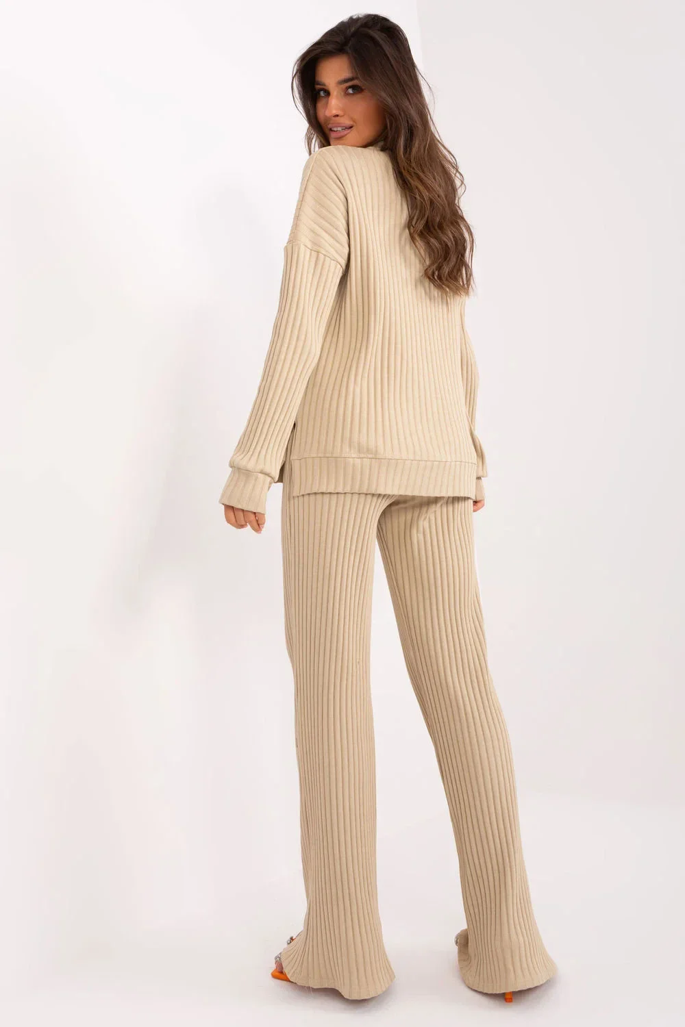 Pohodlný a stylový dámský komplet z pruhované látky, skvělý na každý den i do práce. Vyrobený z vysoké kvality bavlny s přídavkem elastanu, zajišťuje pohodlí nošení, pružnost a ideální přizpůsobení postavě. Hladká struktura spolu s proužkováním mu dodává jemný, moderní charakter. Mikina s volným střihem má dlouhý rukáv a klasický kulatý výstřih, co ji činí univerzální a pohodlnou. Kalhoty s vysokým pasem a širokými nohavicemi zaručují volnost pohybu, a boční kapsy přidávají funkčnost. To je skvělá volba pro ženy, které ocení neformální styl, pohodlí a módní vzhled!