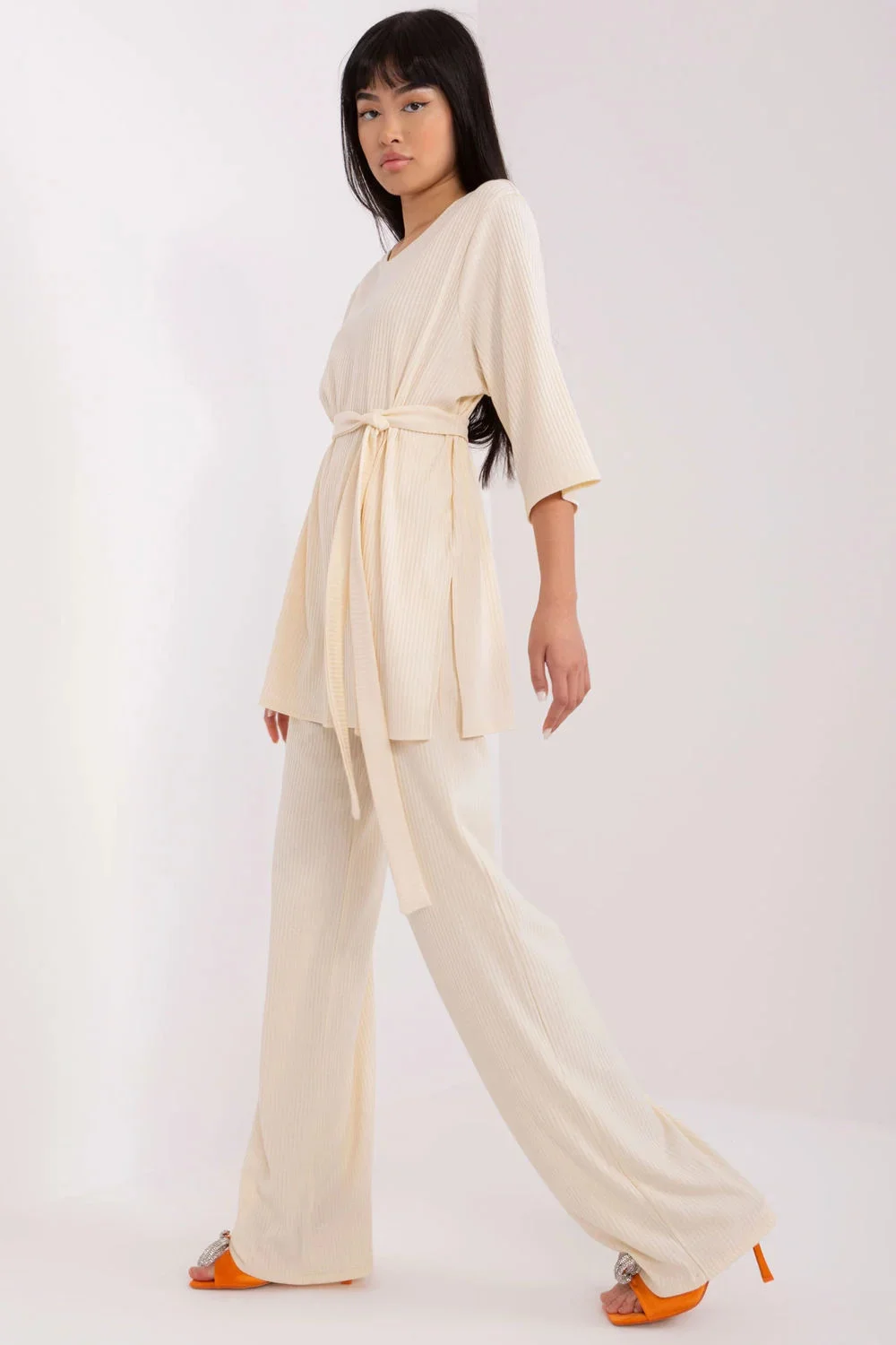 Elegantní a pohodlný dámský set z pruhované látky, ideální na každý den. Vyroben z vysoké kvality bavlny s přídavkem elastanu, poskytuje pohodlí a skvělé přizpůsobení postavě. Hladká struktura a decentní proužky mu dodávají moderní, minimalistický charakter. Blůzka s 3/4 rukávem má klasický, univerzální střih, který skvěle ladí se širokými kalhotami s vysokým pasem. Další výhodou je pásek k zapínání, který podtrhuje pas a dodává stylizaci elegantní akcent. Boční kapsy zvyšují funkčnost a pohodlí. Je to skvělá volba pro ženy, které ocení ležérní styl, svobodu a módní detaily!