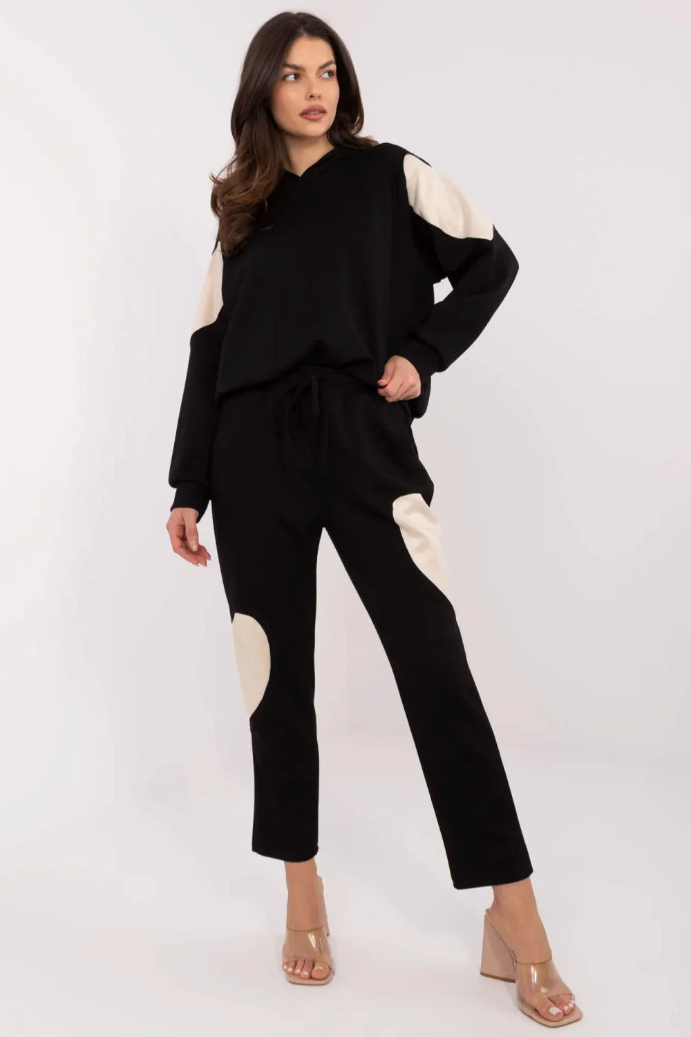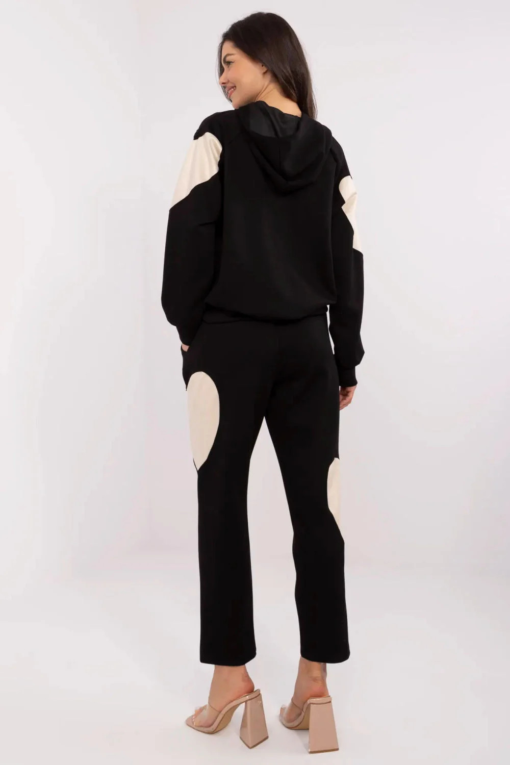 Dámský teplý set je ideální kombinací pohodlí a stylu na každý den. Skládá se z mikiny s kapucí a kalhot s vysokým pasem, které se skvěle přizpůsobí postavě. V pasu je praktické šňůrování, které umožňuje nastavení obvodu. S jak mikina, tak kalhoty mají jednoduchý, minimalistický střih, který se hodí do každodenních stylizací. Dlouhé nohavice a rukávy zajišťují pohodlí při nošení a boční kapsy přidávají funkčnost. Materiál z polyesteru, bavlny a elastanu je měkký, příjemný na dotek a dobře padne na tělo. Hladký vzor oživují jemné srdcové nášivky umístěné na rukávech a nohavicích, dávají celku výjimečný charakter. Je to skvělá volba pro každodenní aktivity, relaxaci doma nebo pro procházku.