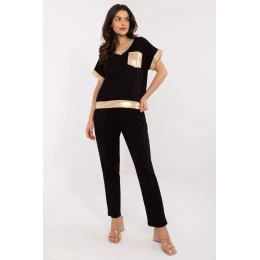 Elegantní a pohodlný dámský set je skvělou volbou jak do práce, tak na běžné nošení. Skládá se z kraťasy s krátkým rukávem a výstřihem do V a kalhot s vysokým pasem, které zajistí pohodlí a stylový vzhled. Model je zdoben zlatými detaily na kapse na hrudi, na manžetách a pasu, které dodávají celku jemnou eleganci. Šňůrka v pase umožňuje ideální přizpůsobení siluetě a boční vložené kapsy zvyšují funkčnost. Vyrobený z příjemné směsi viskózy, bavlny a elastanu, set se skvěle přizpůsobí tělu a zajistí pohodlí po celý den. Hladký vzor a rovné nohavice dělají z tohoto setu univerzální kousek, který se skvěle doplňuje s různými doplňky. Bavlna 30 %