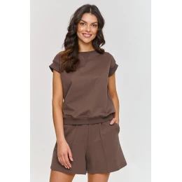 Tento teplákový set je kombinací pohodlí a módního vzhledu, ideální na letní dny a aktivity venku. Triko s volným střihem s elastickými lemy získává na pružnosti a univerzálnosti. Raglánové rukávy opticky zužují horní linii ramen a poskytují široký rozsah pohybu. Krátké šortky mají elastický pas, který zajistí pohodlné padnutí a volný střih neomezuje pohyby. Boční kapsy jsou praktickým doplňkem, který zvyšuje funkčnost. Lem na šortkách jim dodává sofistikovanější charakter a zároveň přidává stylizaci trochu formálnější výraz. Tento detail je činí elegantnějšími, ideálními jak na každodenní nošení, tak i na trochu oficiálnější příležitosti. Navíc takové prošívání na nohavicích opticky prodlužuje nohy a zajišťuje, že šortky mají štíhlý tvar, což je výhodné pro siluetu. Teplákový set spojuje jemnou eleganci se stylovým designem a zároveň zaručuje maximální pohodlí a nadčasový charakter.
