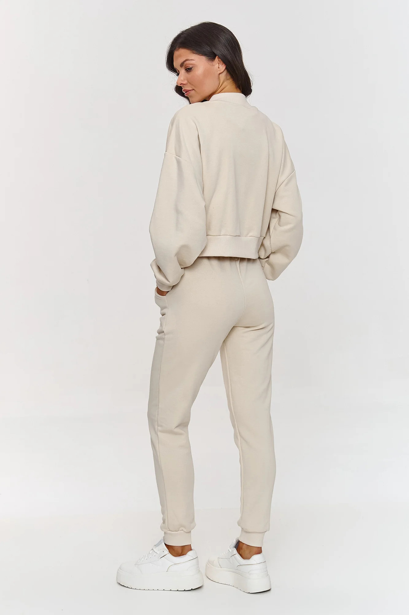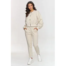 Kompletní 3v1 s bomber bundou je návrh, který dodá svěžest každému dennímu outfitu. Sada se skládá z lehké bomber bundy, trička se proužky a kalhot s volným střihem, vytvářející módní, souvislý celek. Krátká bomber bunda díky zapínání na kovové knoflíky získává charakter a funkčnost. Lem a manžety s elastickými lemy jí dodávají sportovní charakter, co se skvěle hodí k zbytku outfitu. Klasické kalhoty s přímým střihem zajišťují volnost pohybu a kapsy po stranách zdůrazňují jejich praktičnost. Pruhovaný top díky jednoduché konstrukci skvěle ladí s volným tričkem a kalhotami, zdůrazňujíce siluetu a zároveň poskytující stylový vzhled. Jedná se o teplákový set, který se hodí jak na setkání s přáteli, tak na lenivé víkendy. Vytvořte si svůj denní, módní vzhled s touto sadou, která spojuje nadčasovou pohodlí a styl.