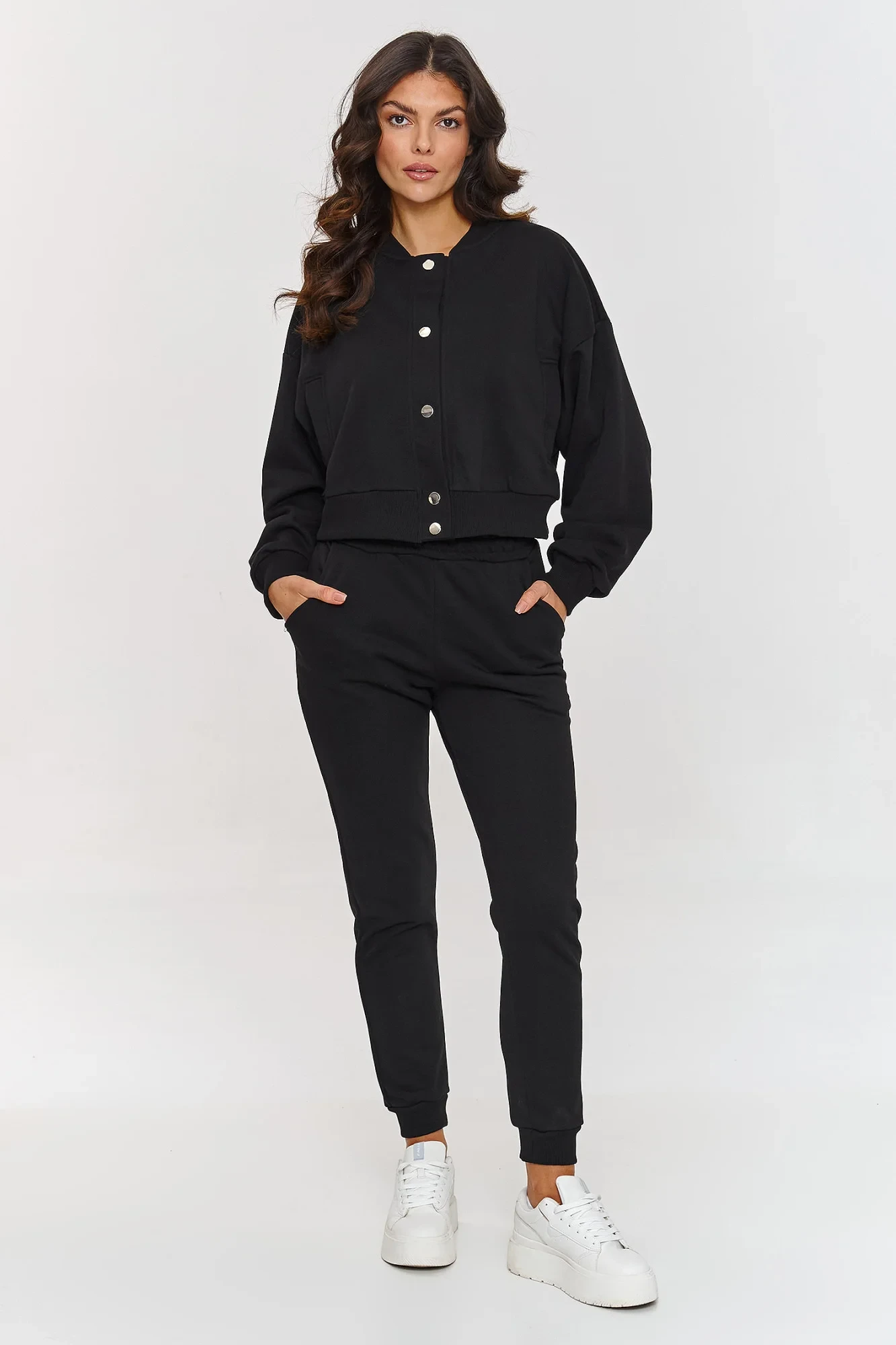 Kompletní 3v1 s bomberem je návrh, který přinese čerstvost každému každodennímu outfitu. Sada se skládá z lehkého bomberu, pruhovaného topu a volných kalhot, vytvářející módní, souvislý celek. Krátký bomber díky zapínání na kovové knoflíky získává charakter a funkčnost. Lem a manžety s elastickými žebry dodávají sportovní charakter, co skvěle ladí s celým outfitem. Klasické kalhoty s jednoduchým střihem zajistí volnost pohybu a boční kapsy zdůrazňují jejich praktičnost. Pružný top díky jednoduché konstrukci skvěle ladí s volnou mikinou a kalhotami, zdůrazňující siluetu a zároveň poskytující stylový vzhled. Je to sportovní set, který se osvědčí jak na setkání s přáteli, tak na lenivé víkendy. Vytvořte si svůj každodenní, stylový vzhled s touto sadou, která kombinuje nadčasovou pohodlí a styl.