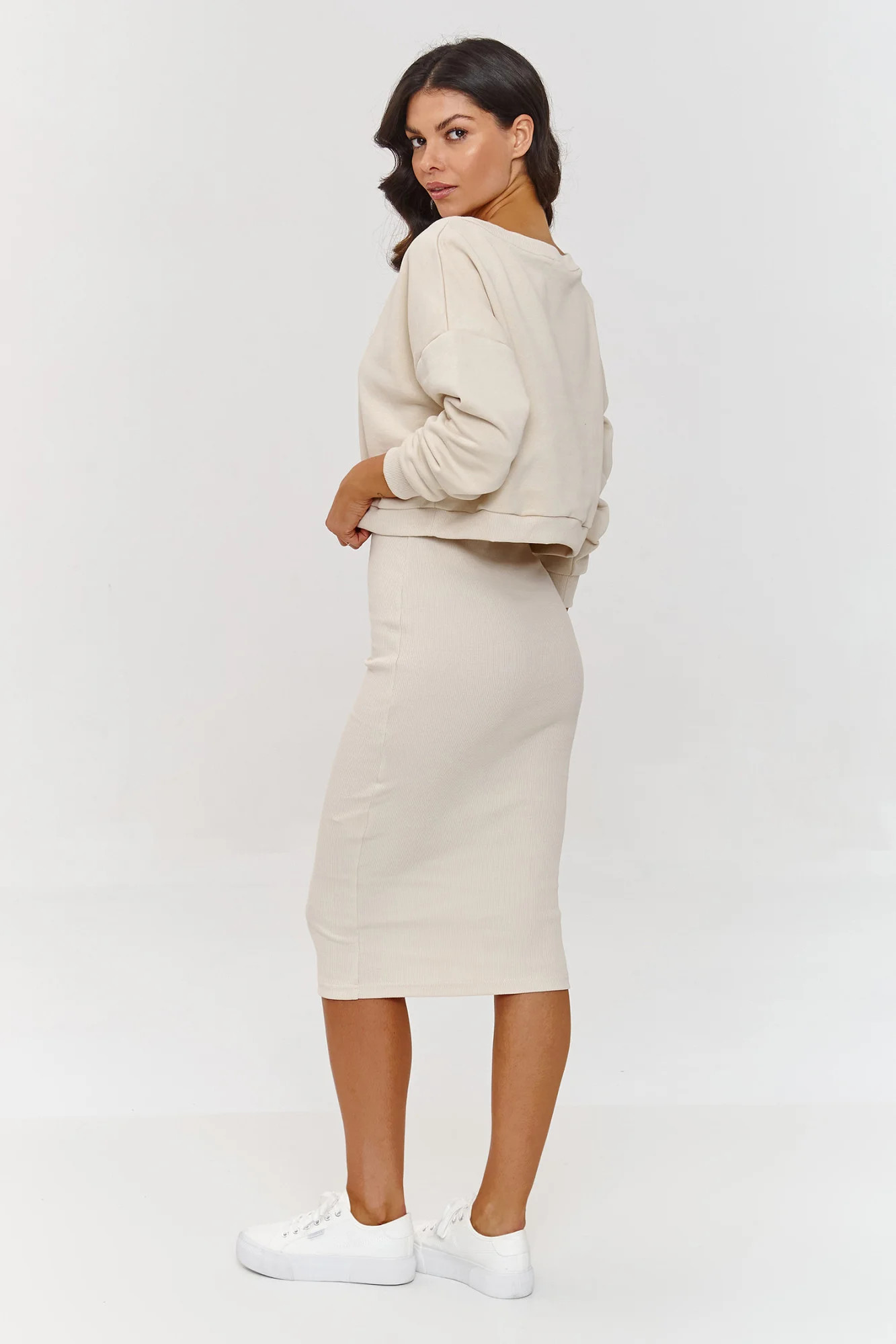 Tento teplákový set je nabídkou pro ženy, které oceňují styl s nádechem pohodlí. Jednoduchý střih a univerzální forma šatů dokonale zdůrazňuje postavu. Díky pružné struktuře materiálu je zároveň elastická a kompaktní, poskytující plnou volnost pohybu. Midi délka je klasikou módy, která navíc zdůrazňuje eleganci a nikdy nevyjde z módy. Volný střih mikiny a výstřih ve tvaru písmene V jí dodávají volný, ale stylový charakter. Rukávy zakončené pružinkami umožňují regulaci jejich délky, a krátký střih je ideální k šatům, dodávající jim lehkost. Volná mikina a přiléhavé šaty tvoří módní, ale praktický vzhled, který se hodí jak na každodenní setkání, tak i na relaxační dny doma.