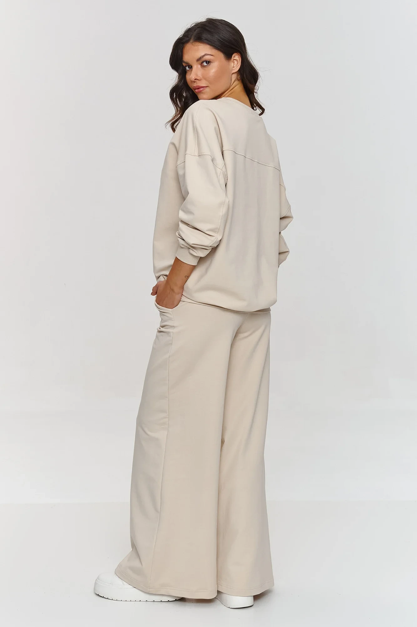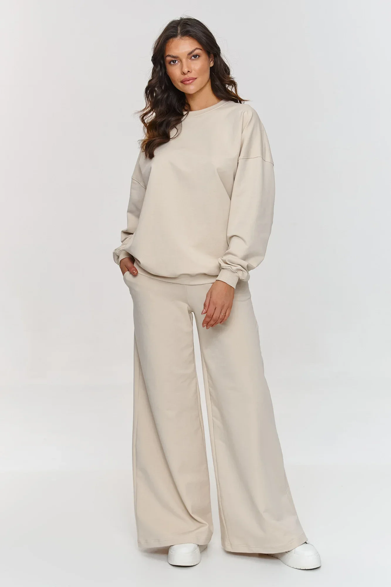 Tento teplákový set je ideální volbou pro ženy, které ocení funkčnost a styl. Sestava se skládá z oversized mikiny s dlouhými rukávy a volných kalhot, které vytvářejí pohodlný, ale stylový celek. Díky širokému střihu kalhoty poskytují plnou volnost pohybu a elastický pas se přizpůsobí postavě. Navíc jsou rozšiřovány ke spodu, což dává sestavě výjimečný a dynamický charakter. Mikina s klasickým kulatým výstřihem a rukávy zakončené pružnými lemy doplňují celek, vytvářejí pohodlný a zajímavý set. Teplákový oblek je vyroben z měkkého a příjemného materiálu, který zaručuje pohodlí každý den. Díky jednoduchému, ale efektnímu střihu se sestava skvěle hodí do různých situací. Náš teplákový set spojuje pohodlí, funkčnost a moderní vzhled. Hodí se jak na odpočinek doma, tak na setkání s přáteli, nákupy nebo do práce. Set skvěle ladí s oblíbenými teniskami, tvoří stylovou, pohodlnou a módní stylizaci.