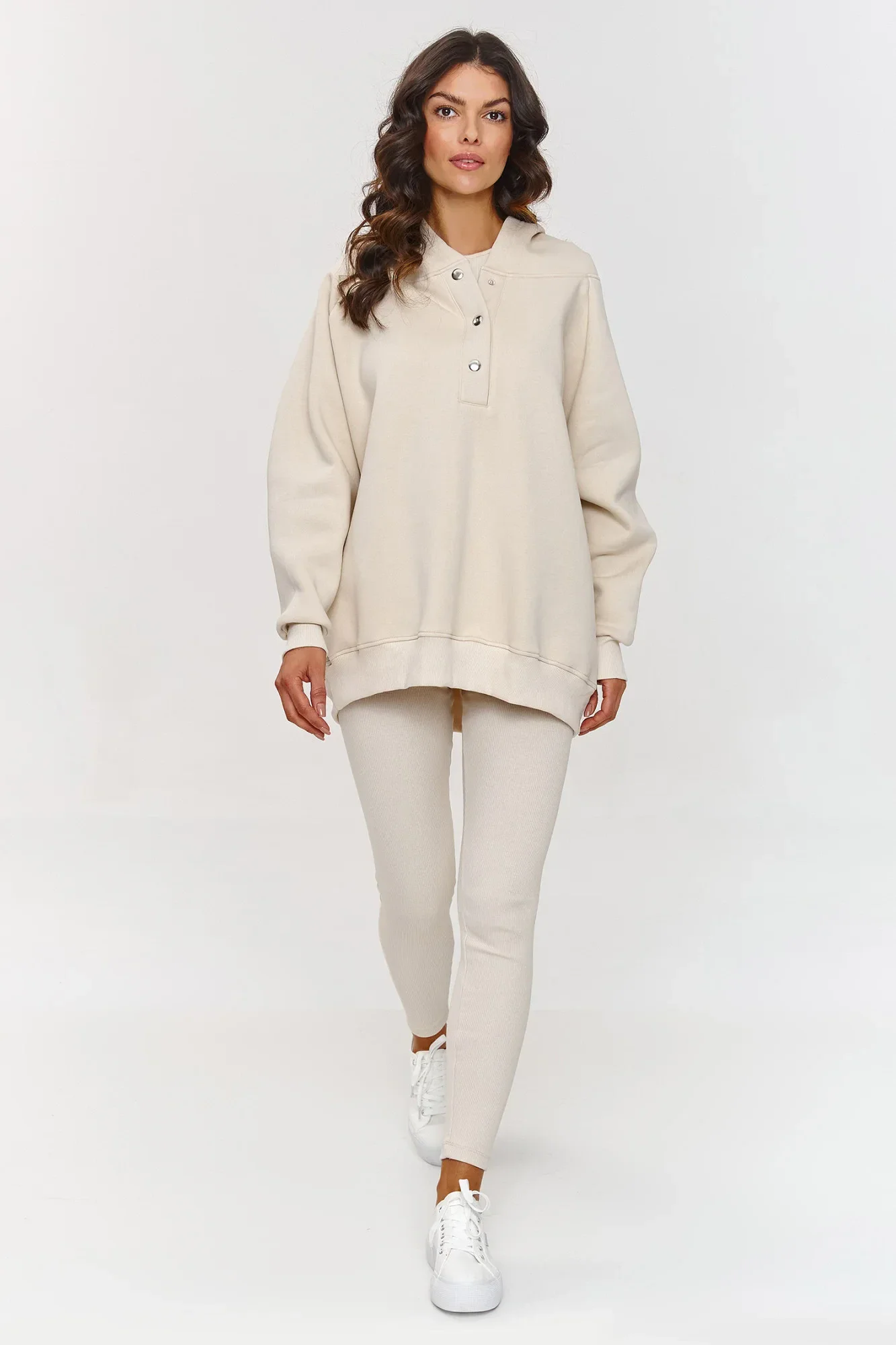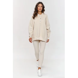 Kompletní 3v1 s nápami je nabídka, která se úspěšně osvědčí v mnoha každodenních situacích, kombinující pohodlí s módním vzhledem. Sada se skládá z mikiny, topu a legín. Mikina v této sadě vyniká límcem zapínacím na knoflíky, co jí dodává stylový, ale i praktický charakter. Volný střih zaručuje plnou volnost pohybu, a pružné manžety na rukávech a na spodku mikiny zajišťují pohodlí, přizpůsobují oděv tělu a zabrání vytahování materiálu. Navíc límec je obohacen o jemný detail v podobě kovových knoflíků. Pružkovaný top má krátký střih, který skvěle ladí s přiléhavými legíny. Jeho jednoduchý střih s kulatým výstřihem z něj dělá klasický prvek, který lze snadno zkombinovat s jiným oblečením. Legíny jsou vyrobeny také z pružkovaného materiálu, který se ideálně přizpůsobuje postavě, zdůrazňuje její tvary, ale zároveň zajišťuje pohodlí. Materiál je elastický, co umožňuje plnou volnost pohybu, ideální na každodenní vycházky nebo cvičení. Kombinace hladké mikiny s topem a legínami vyrobenými z texturovaného materiálu vytváří zajímavý, souvislý a praktický outfit, který splní vaše očekávání bez ohledu na roční období. Bavlna 10 %