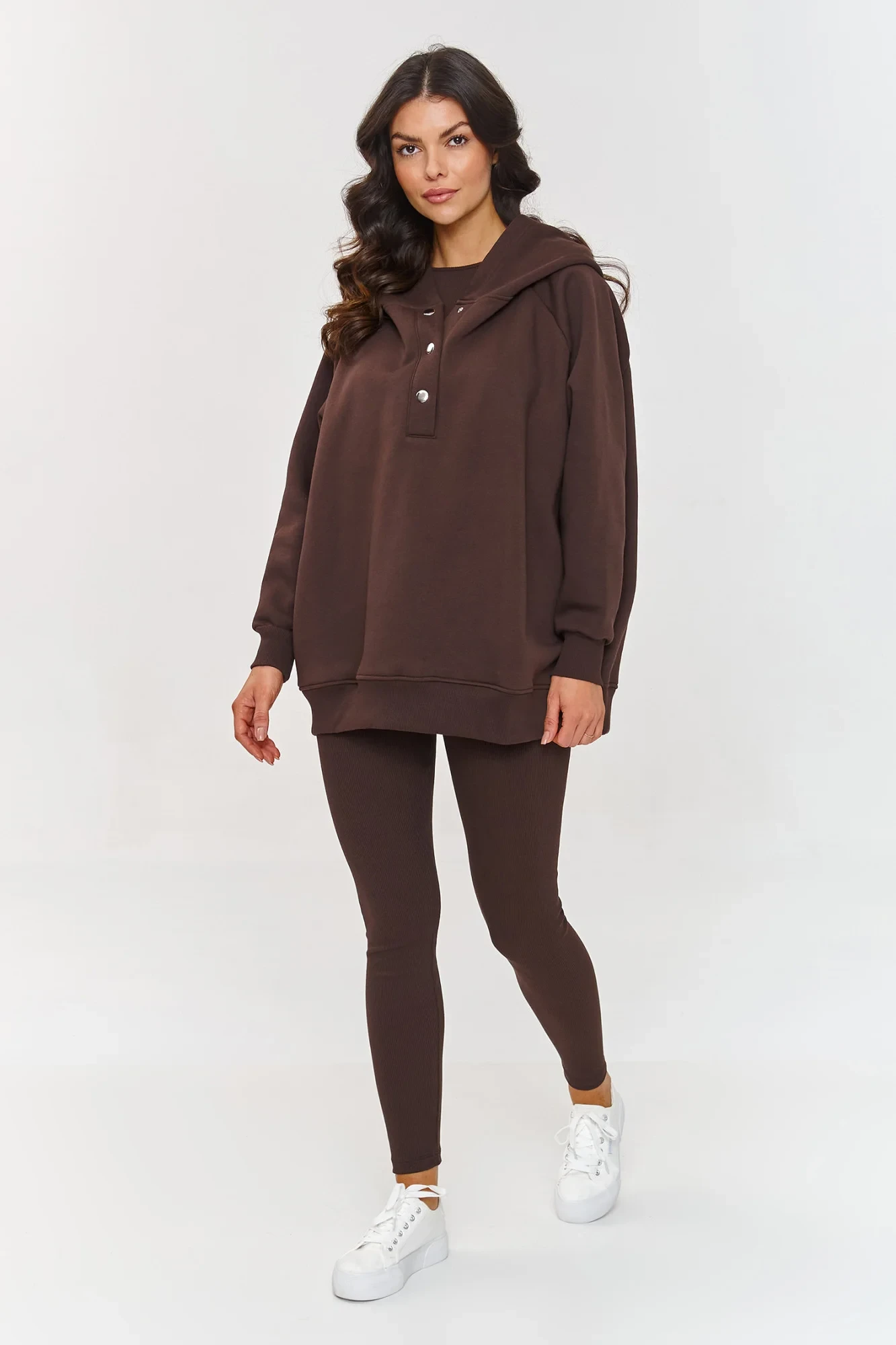 Kompletní set 3v1 s nápami je nabídkou, která se úspěšně osvědčí v mnoha každodenních situacích, spojující pohodlí s módním vzhledem. Sada se skládá z mikiny, topu a legín. Mikina v tomto setu vyniká límečkem zapínacím na knoflíky, co jí dodává stylový, ale také praktický charakter. Volný střih zajistí plnou volnost pohybu, a manžety na rukávech a na spodku mikiny zajišťují pohodlí, přizpůsobují oblečení tělu a brání zvěšování materiálu. Navíc límeček je obohacen o decentní detail ve formě kovových knoflíků. Pruhovaný top má krátký střih, který se skvěle kombinuje s přiléhavými legínami. Jeho jednoduchý střih s okrouhlým výstřihem z něj činí klasický prvek, který lze snadno sladit s jiným oblečením. Legíny jsou také vyrobeny z pruhovaného materiálu, který se dokonale přizpůsobí siluetě, zdůrazňujíce její tvary, ale zároveň zajistí pohodlí. Materiál je elastický, což umožňuje plnou volnost pohybu, ideální na každodenní vycházky nebo cvičení. Kombinace hladké mikiny s topem a legínami vyrobenými z texturovaného materiálu vytváří zajímavý, souvislý a praktický outfit, který splní vaše očekávání bez ohledu na roční období.