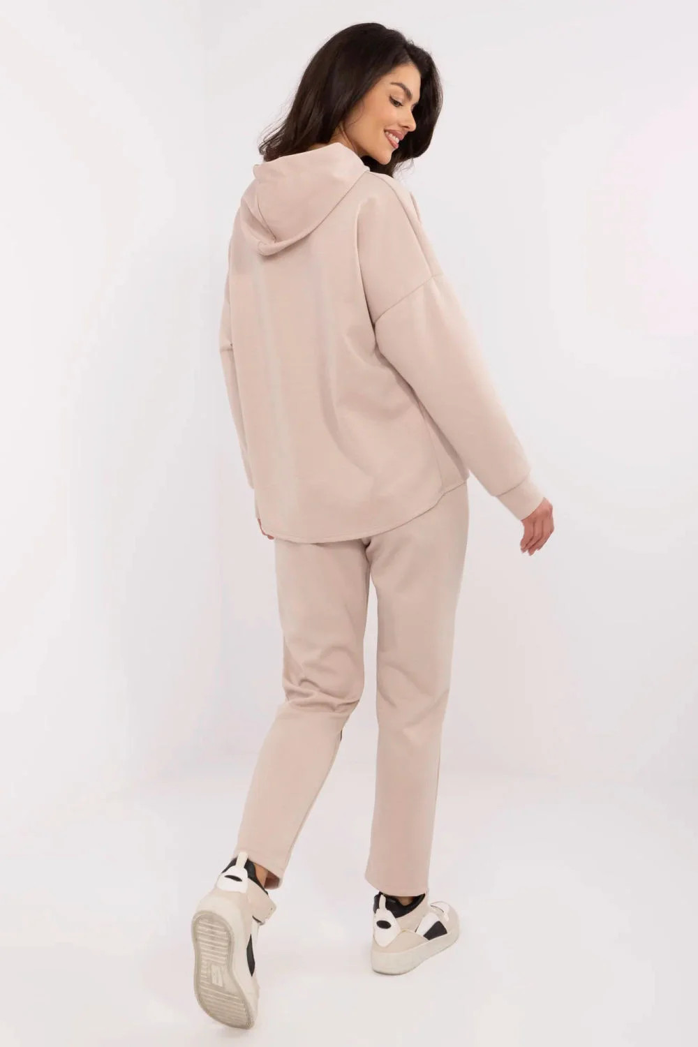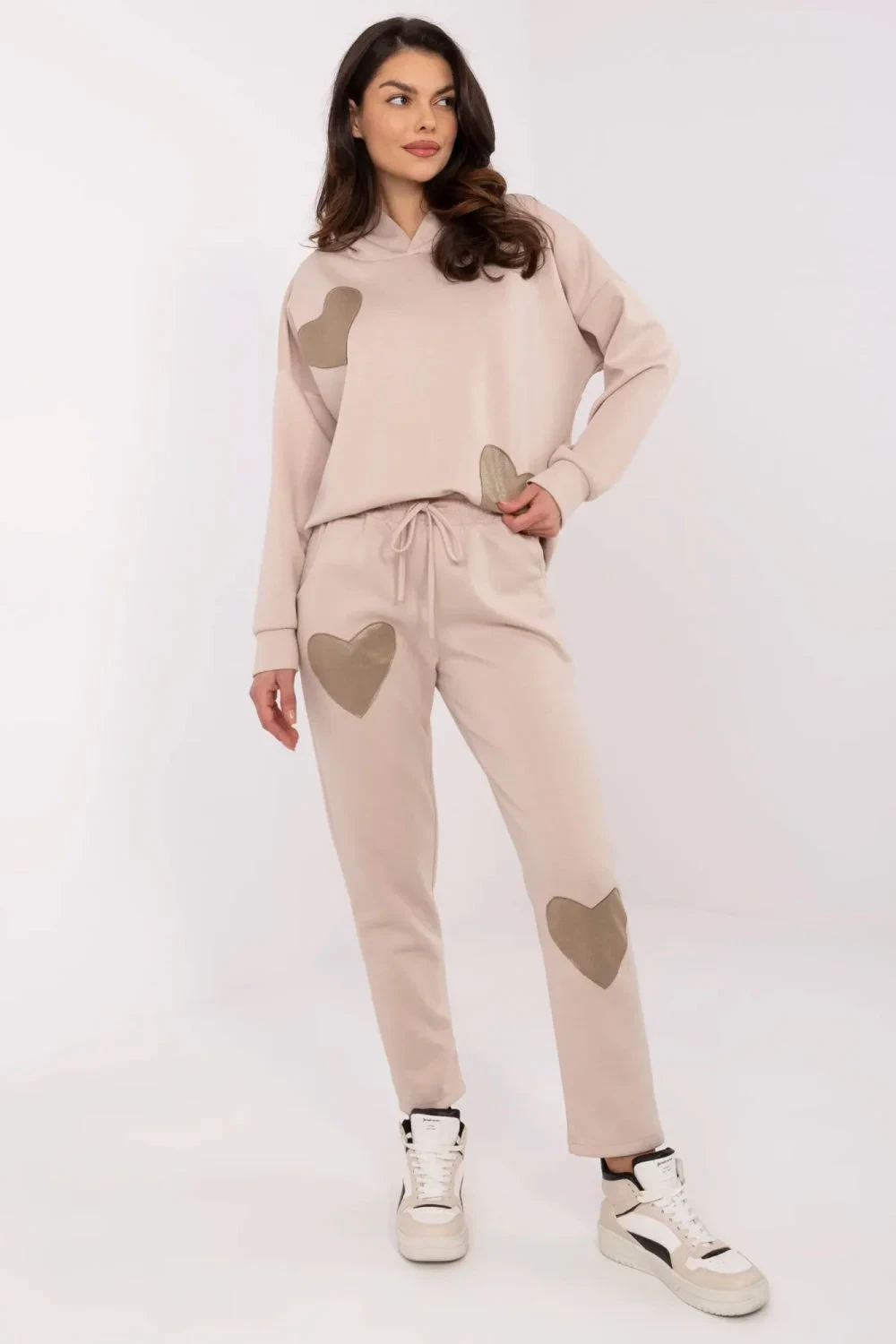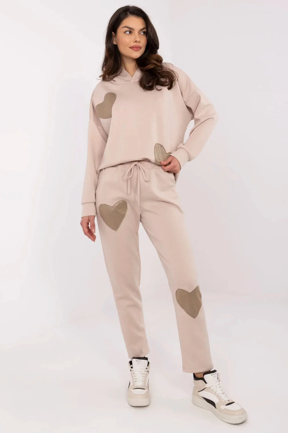 Casual dámský set, skládající se z teplákové soupravy, který kombinuje pohodlí s moderním vzhledem. Vyrobený z měkké směsi viskózy, bavlny a elastanu, zajistí pohodlí během celého dne. Hladký materiál mu dodává univerzální charakter, a ozdobné nášivky ve tvaru srdce na mikině a kalhotách přidávají jemnou, ženskou eleganci. Mikina s dlouhým rukávem a praktickou kapucí se skvěle hodí na chladnější dny. Kalhoty s rovným střihem a vysokým pasem s bočními kapsami zaručují pohodlí a volnost pohybu. Jedná se o ideální volbu pro každodenní outfit, skvělý jak na procházku, tak na relaxaci v domácím útulku.