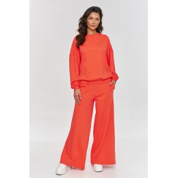 Tento teplákový set je ideální volbou pro ženy, které oceňují funkčnost a styl. Sestava se skládá z oversized mikiny s dlouhými rukávy a volných kalhot, které vytvářejí pohodlný, ale stylový celek. Díky širokému střihu kalhoty poskytují plnou volnost pohybu a elastický pas se přizpůsobí postavě. Navíc se rozšiřují ke spodní části, což dává setu výjimečný a dynamický charakter. Mikina s klasickým kulatým výstřihem a rukávy s manžetami dokončují celek, vytvářející pohodlný a zajímavý set. Teplákový set je vyroben z měkkého a příjemného materiálu, který zajistí pohodlí každý den. Díky jednoduchému, ale efektnímu střihu se set skvěle hodí do různých situací. Náš teplákový set je volbou, která spojuje volnost, funkčnost a moderní vzhled. Skvěle se hodí jak na odpočinek doma, tak na setkání s přáteli, nákupy nebo do každodenního nošení. Set skvěle ladí s oblíbenými teniskami, vytvářející stylový, pohodlný a módní outfit.
