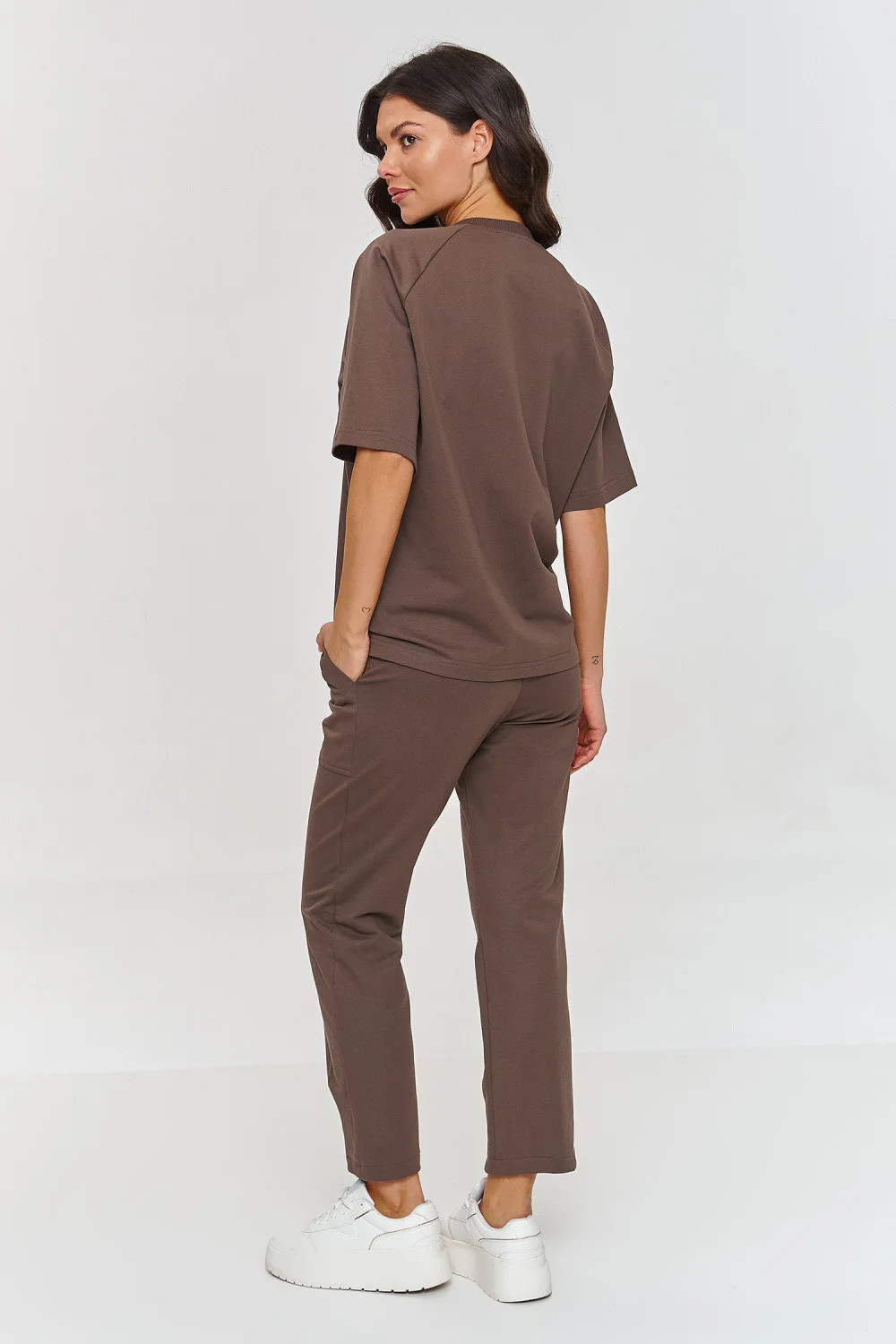 Tento pohodlný teplákový set je ideální volbou pro každodenní outfit a aktivní odpočinek. Má volný svetr s kulatým výstřihem zakončeným jemným lemem a raglánovými rukávy, které jsou skvělé pro ty, kteří chtějí upravit ramenní linii. Klasické kalhoty s rovnými nohavicemi mají gumu v pase, která umožňuje přizpůsobení se postavě a velké nášivky kapes dodávají stylový akcent a funkčnost. Toto spojení oblečení vytváří harmonický a pohodlný celek. Jednoduchý a volný střih tohoto setu z něj dělá nadčasový a univerzální kus, který přitom zachovává volnost a módní vzhled. Teplákový set je vyroben z prodyšného bavlněného materiálu, což ho činí praktickým i během teplejších dní. Tento set se skvěle hodí na každodenní vycházky, nákupy, setkání s přáteli nebo jiné fyzické aktivity. Tento teplákový set je spojením funkčnosti a stylu, ideální pro ty, kteří chtějí být pohodlní, aniž by ztratili módní vzhled.