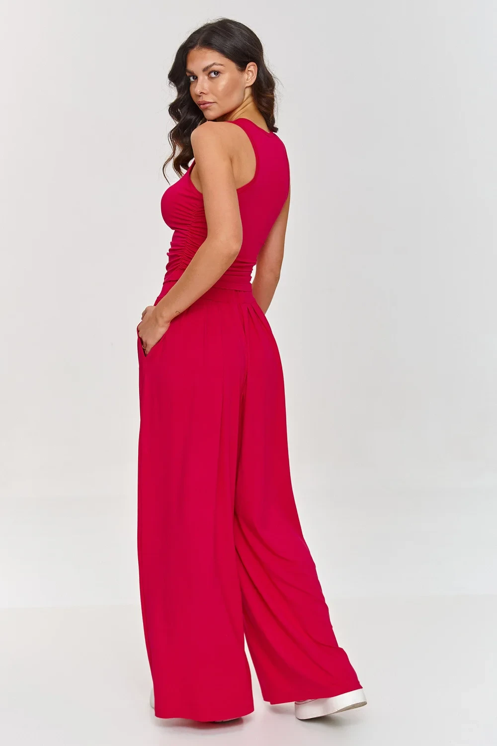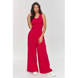 Volný dámský komplet je ideální volbou pro ženy, které hledají spojení pohodlí s elegancí. Součástí setu je přiléhavý top s ramínky, který je navíc ozdoben záhyby na bocích, a široké kalhoty s vysokým pasem, které společně vytvářejí módní a pohodlný outfit. Vyrobený z lehké, vzdušné viskózy je komplet skvělý na teplé dny, poskytující pocit volnosti po celý den. Set je jednoduchý, ale efektní, spojující pohodlí s moderním vzhledem. Může být nošen jak na každý den, tak na méně formální setkání. Skvěle ladí s bílými teniskami nebo sandály, vytvářející ležérní look, ale stejně dobře se hodí i k elegantnějším doplňkům. Nepopiratelnou výhodou tohoto setu je materiál, který se vyznačuje skvělou prodyšností, což zajišťuje příjemné nošení i po dlouhé hodiny. Náš viskózový komplet je skvělou letní volbou, která spojuje stylový design s pohodlím. Skvěle se hodí jak do práce, na společenská setkání, tak i na relaxační dny v zahradě. Investujte do tohoto módního setu, který vám zajistí pohodlí a styl po celý den!
