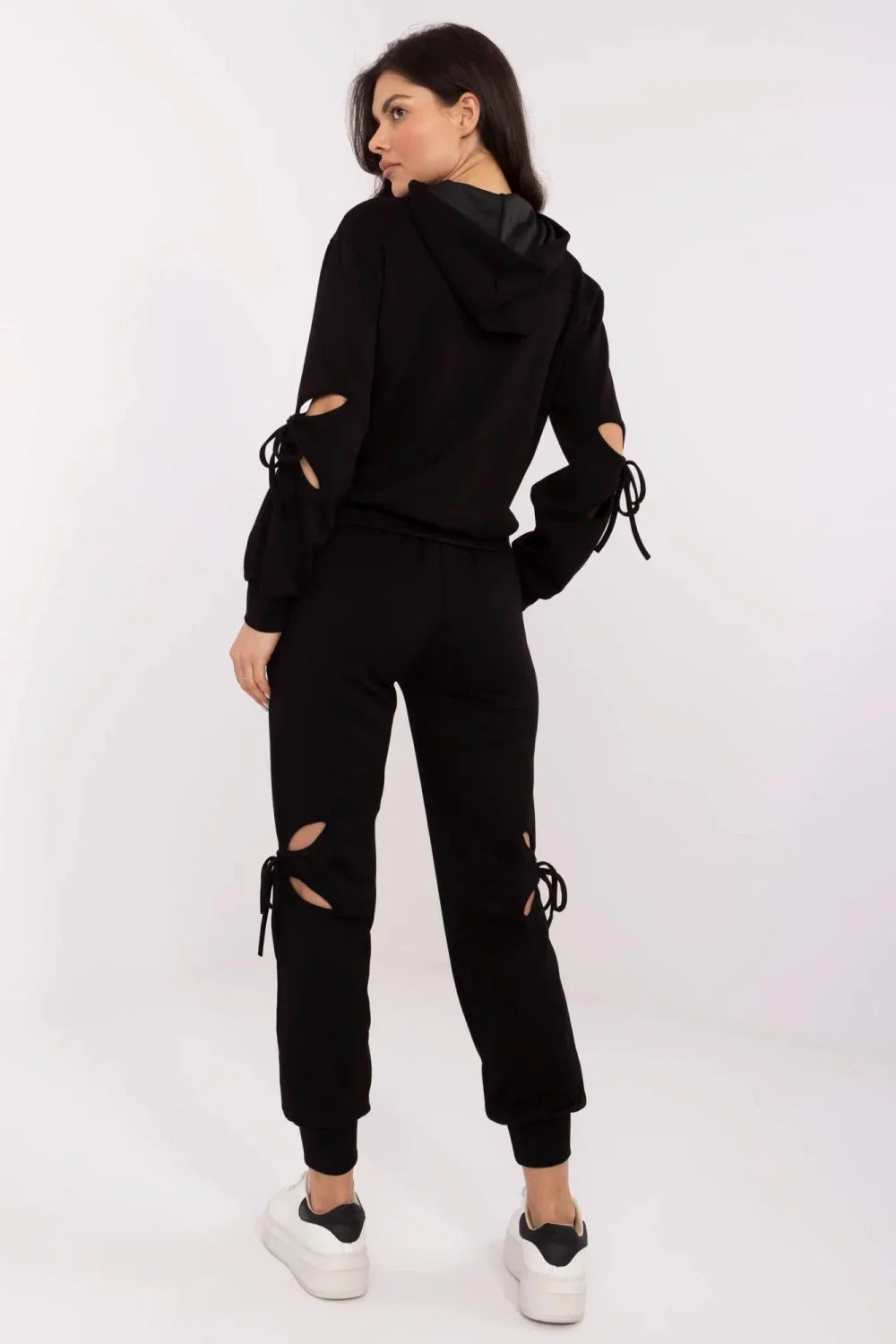 Casualový dresový komplet je ideální kombinací pohodlí a módního stylu. Vyroben z měkké směsi viskózy, polyesteru a elastanu, zajišťuje pohodlí při nošení a volnost pohybu. Mikina s kapucí má dlouhý rukáv a decentní rozparky na rukávech s ozdobnými šňůrkami, které dodávají celku originální charakter. Kalhoty s vysokým pasem a bočními kapsami na vkládání zaručují pohodlí, a náplety u nohavic zvýrazňují sportovní styl. Další výhodou jsou rozparky na nohavicích s ozdobnými šňůrkami, které dodávají neotřelý vzhled. Elastický pas se šňůrkou umožňuje dokonalé přizpůsobení. To je vynikající volba na každý den pro ženy, které si cení pohodlí a módního akcentu ve stylizacích. Komplet vyrobený z materiálu typu máslo, mimořádně měkkého, příjemného na dotek, dokonale se přizpůsobujícího tělu.