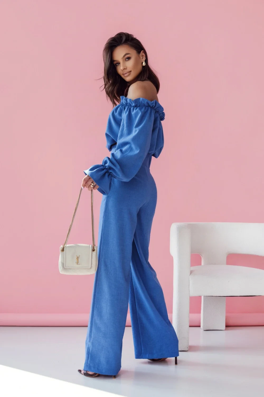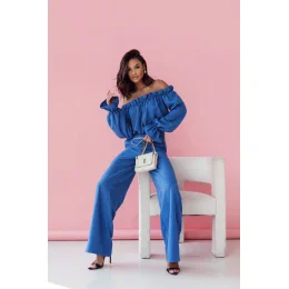 Elegantní a ženský dámský set, který spojuje klasiku s jemnými detaily. Blůza s dlouhým rukávem zakončeným volánem přidává lehkost a romantiku, a španělský výstřih krásně zdůrazňuje ramena a výstřih, dodávající outfitu smyslný charakter. Dlouhé kalhoty s vysokým pasem zdůrazňují pas a prodlužují nohy, zapínají se po straně na skrytý zip, co jim dodává modernost. Po stranách jsou praktické kapsy, které spojují funkčnost s elegantním vzhledem. Je to ideální set na speciální příležitosti, kombinující pohodlí s módním designem.