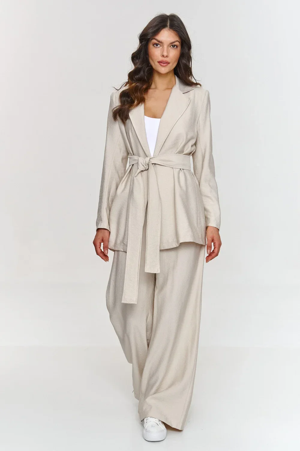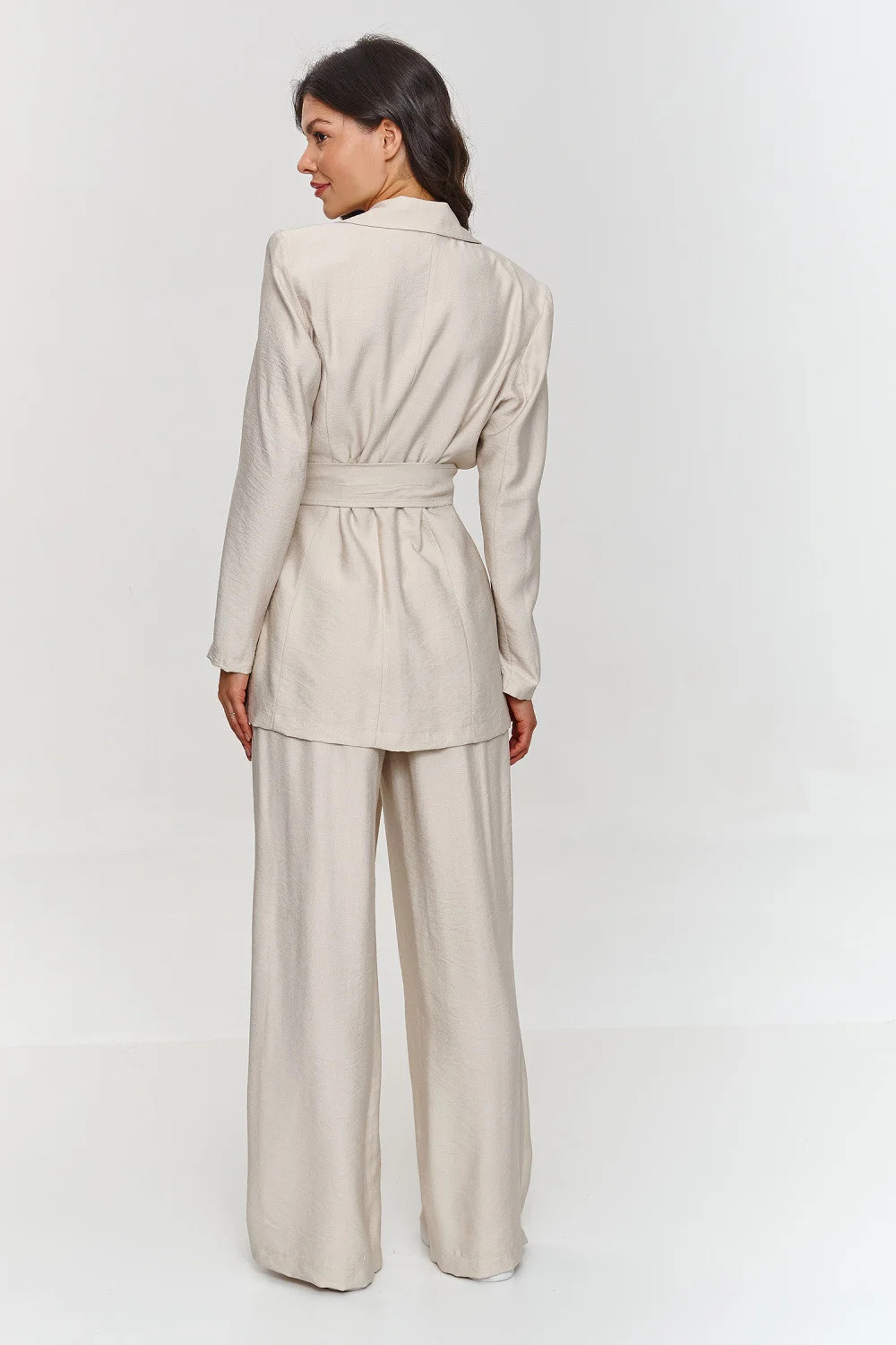 Tento dámský set byl navržen s ohledem na ženy, které hledají spojení stylu, pohodlí a moderní elegance. Sako s delším volným střihem dodává outfitu moderní charakter a pásek umožňuje přizpůsobení postavy a zdůraznění pasu. Nemá podšívku, což ho dělá lehčím a volnějším. Kalhoty s širokými nohavicemi zdůrazňují módní vzhled a elastický pás zajistí maximální pohodlí. Model je vyroben z lehkého strukturovaného materiálu, který zdůrazňuje jeho výjimečnost a třídu. Další výhodou je možnost nosit každý kus samostatně a vytvářet různé a originální outfity. Díky jednoduchému, ale efektnímu designu je tento set skvělým řešením jak pro večery s přáteli, tak do kanceláře, na obchodní schůzky a jiné formální události, kde chcete vypadat profesionálně a zároveň nechcete ustupovat pohodlí.