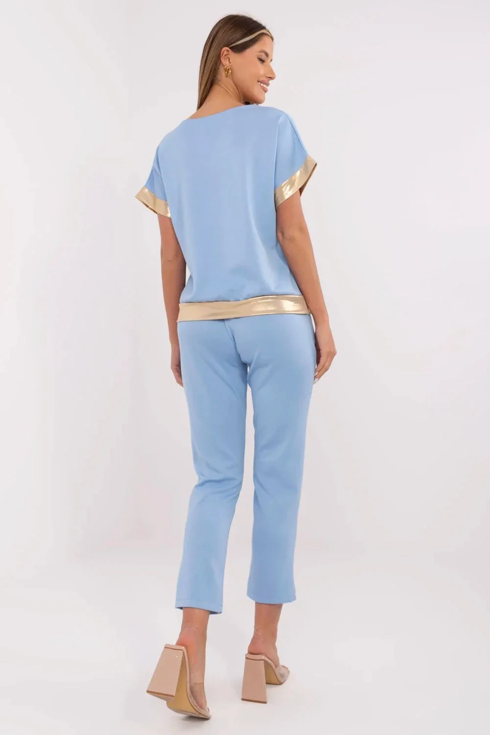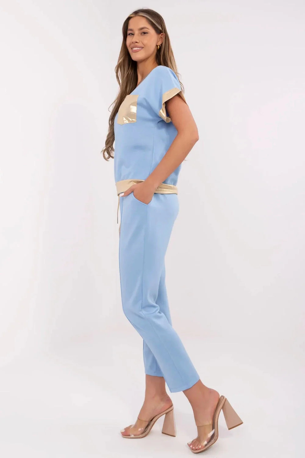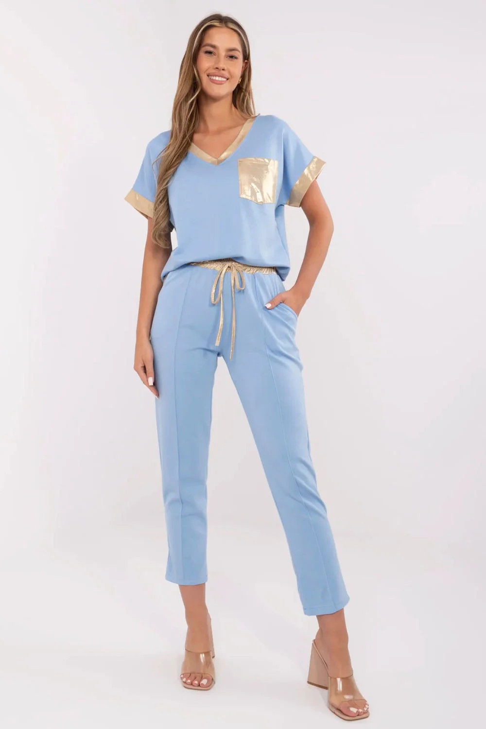 Elegantní a pohodlný dámský set je skvělou volbou jak pro každodenní nošení, tak do práce. Skládá se z košile s krátkým rukávem a výstřihem do V a kalhot s vysokým pasem, které zaručují pohodlí a stylový vzhled. Model vyniká zlatými akcenty na kapse na prsou, na manžetách a pasu, které dodávají celku jemnou eleganci. Šněrování v pase umožňuje ideální přizpůsobení postavě, a boční kapsy s funkcí vkládání zvyšují funkčnost. Vyrobený z příjemné směsi viskózy, bavlny a elastanu se set skvěle přizpůsobí tělu a zaručí pohodlí po celý den. Hladký vzor a rovné nohavice dělají tento set univerzálním a dokonale se hodí k různým doplňkům.