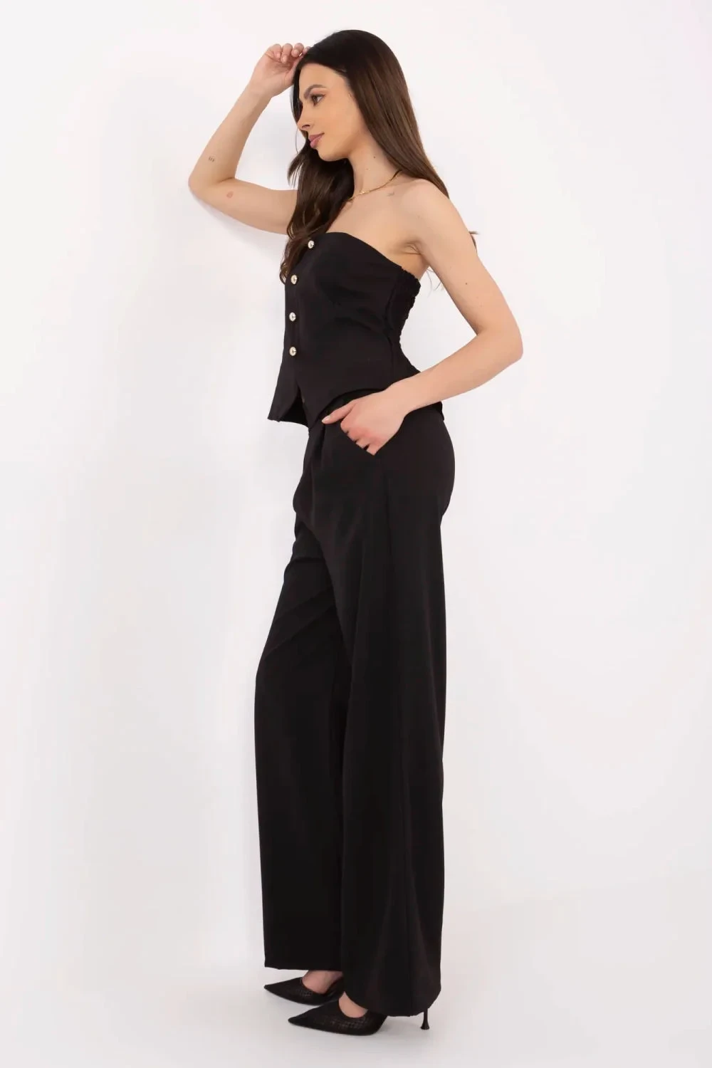 Stylový dámský komplet skládající se z vesty a kalhot je vynikající volbou pro ženy, které ocení eleganci s nádechem modernosti. Ideální na denní nošení, do práce, na společenské akce či večírky, hodí se všude tam, kde záleží na stylu a pohodlí. Vesta bez rukávů s španělským výstřihem je ozdobena dekorativními knoflíky vpředu a efektními řaseními na zádech, které dodávají siluetě jemnou lehkost a zvýrazňují ženskou linku. Kalhoty s vysokým pasem a širokými nohavicemi opticky prodlužují nohy a krásně se přizpůsobují pohybu. Boční kapsy dodávají funkčnost, aniž by narušily elegantní charakter soupravy. Vyrobený z hladkého materiálu, kombinace polyesteru a elastanu, komplet zaručuje pohodlí a styl po celý den.