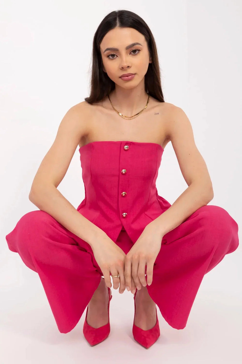 Stylový dámský komplet skládající se z vesty a kalhot je vynikající volba pro ženy, které si cení elegance s nádechem modernosti. Ideální na každodenní nošení, do práce, na společenské příležitosti nebo večírky, se osvědčí všude tam, kde záleží na stylu a pohodlí. Vesta bez rukávů s španělským výstřihem je zdobena dekorativními knoflíky vpředu a efektními nabíráním na zádech, které dodávají siluetě jemnou lehkost a zvýrazňují ženské linie. Kalhoty s vysokým pasem a širokými nohavicemi opticky prodlužují nohy a krásně se usazují v pohybu. Vkládané boční kapsy jim dodávají funkčnost, aniž by narušovaly elegantní charakter soupravy. Vyrobený z hladkého materiálu, kombinace polyesteru a elastanu, komplet zaručuje pohodlí a styl po celý den.