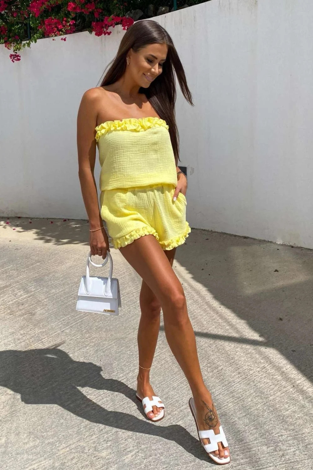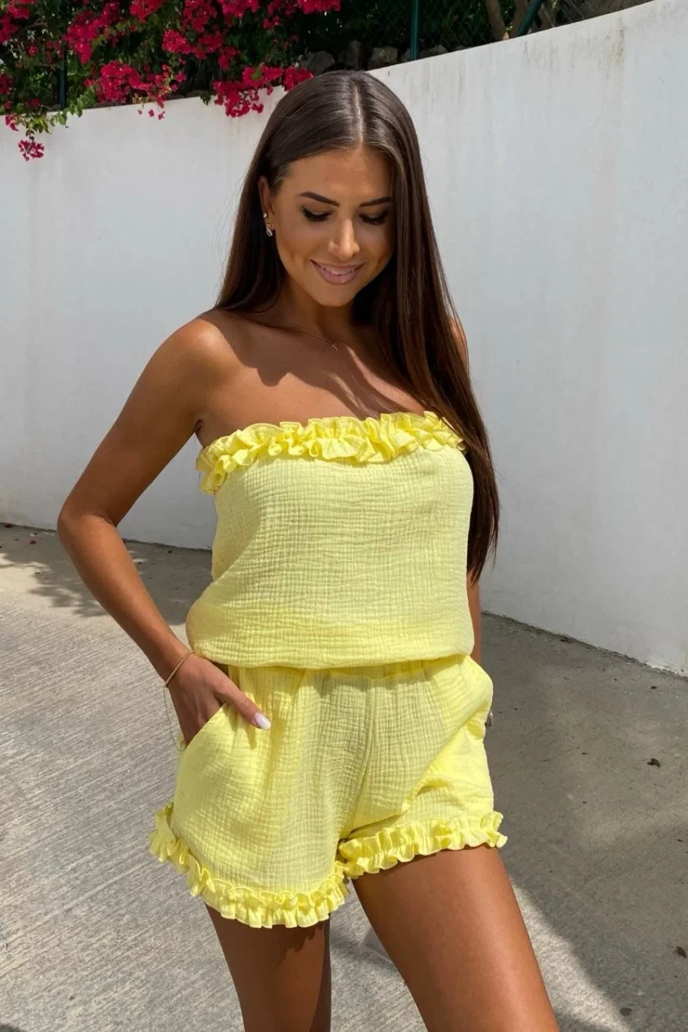 Letní mušelínový komplet s dívčím šarmem, ideální na teplé dny. Top bez ramínek s jemnou volánkou u dekoltu okouzlí lehkostí a romantickým charakterem. Šortky s pohodlným elastickým pasem zajistí pohodlí při nošení, a vsazené kapsy zvyšují funkčnost. Nohavice s volánkou na konci krásně podtrhnou celkový vzhled, vytvářejíce souvislý a stylový siluetu.