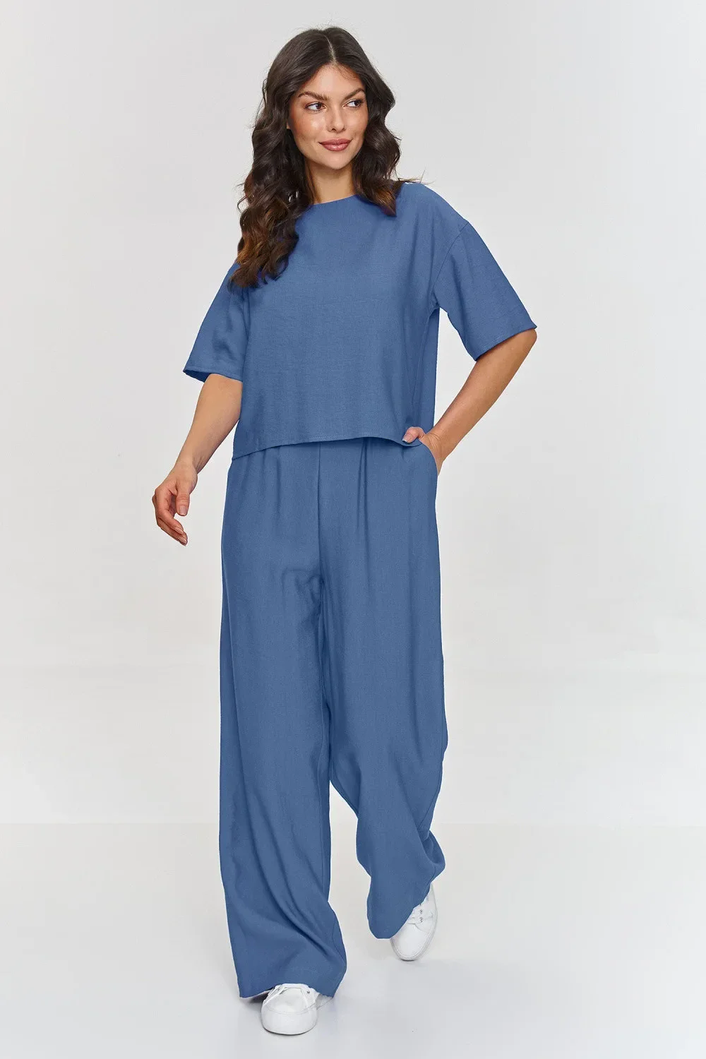 Tento elegantní set je ideální nabídkou na jarní a letní dny, kdy chcete spojit módní vzhled s vysokou kvalitou provedení. Sada obsahuje volnou blůzu ve tvaru kostky, která skvěle ladí s elegantními stylizacemi. Krátký rukáv a jednoduchý střih blůzy z ní činí skvělou volbu pro formální i méně formální události, spojující eleganci s pohodlím. Kalhoty se vyznačují širokými nohavicemi, které stylizaci dodávají moderní a elegantní vzhled. Elastický pas zajišťuje pohodlné nošení a jejich délka přidává celku eleganci a stylu. Model je vyroben z jemného a lehkého materiálu imitujícího len. Jednoduchý, ale vysoce rafinovaný střih dává setu nadčasový charakter, který bude vypadat stylově na každé postavě. Sada se skvěle hodí na obchodní schůzky, elegantní události nebo výlety do města, kdy záleží na spojení elegance a volnosti. Můžete ji kombinovat se špičatými botami, elegantními sandály nebo bílými teniskami.