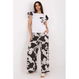 Elegantní dámský set, ideální na každodenní výlety, který spojuje pohodlí s módním vzhledem. Skládá se z tílka s krátkým rukávem ve formě volánu a dlouhých kalhot s širokými nohavicemi, které zajistí volnost pohybu. Tílko je zdobeno decentním motivem zvířat a navíc má kapsu na hrudi, která je praktickým a stylovým detail. Kalhoty s vysokým pasem a elastickým páskem skvěle padnou a zajistí pohodlí po celý den. Bočně umístěné kapsy přidávají funkčnost a moderní charakter. Vyrobené z kombinace bavlny a elastanu, tyto materiály zaručují pohodlí, pružnost a odolnost. Set se skvěle hodí do každodenních outfitů, spojujíc pohodlí s ženským stylem.