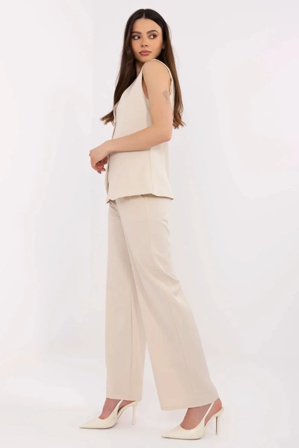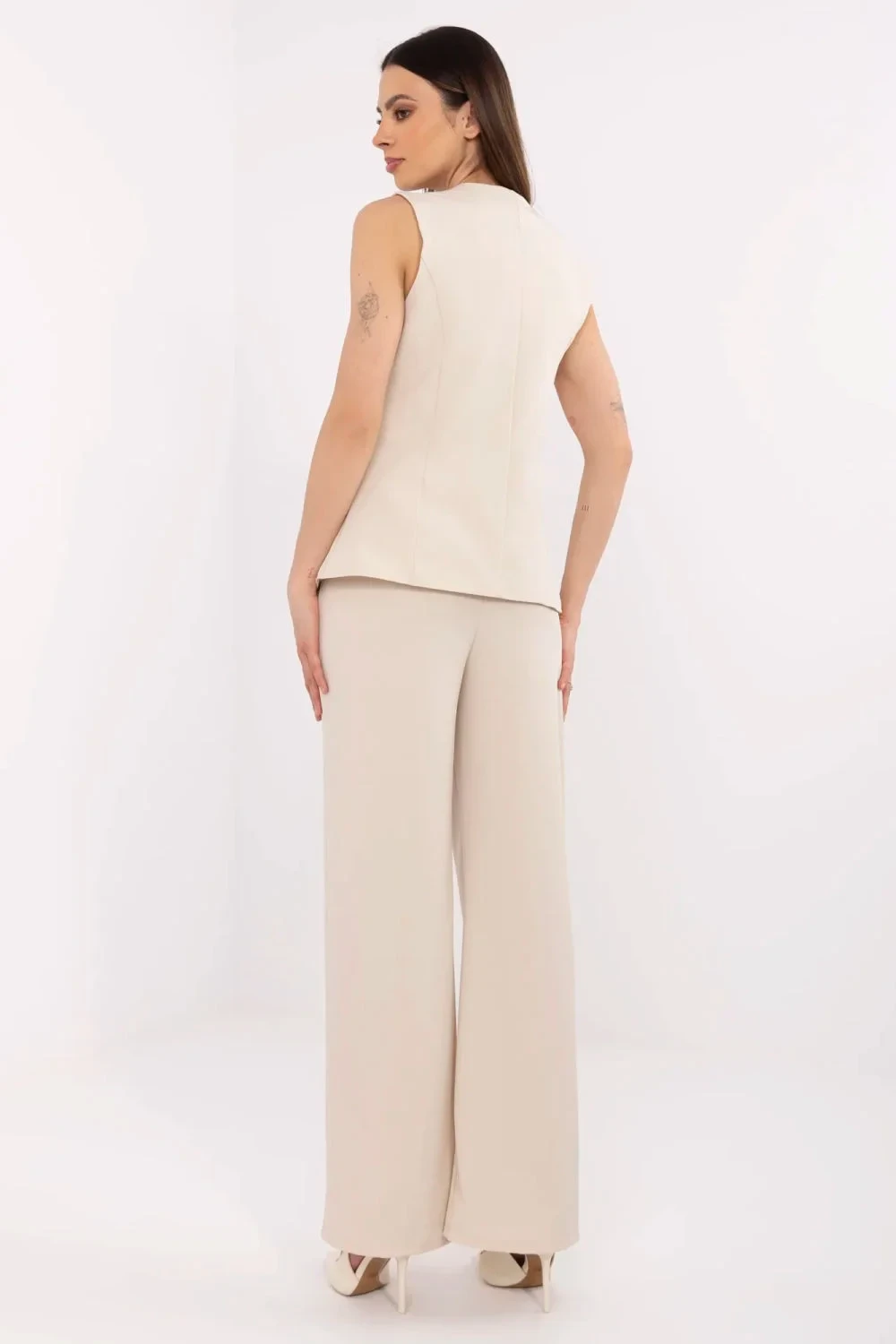 Elegantní dámský set skládající se z vesty a kalhot, ideální na formální příležitosti, do práce nebo na večírek. Vyrobený z vysoce kvalitního polyesteru a elastanu, tento materiál zajistí pohodlí a odolnost a zároveň dodá jemnou eleganci celému outfitu. Set skvěle kombinuje pohodlí s profesionálním stylem, čímž se stává ideální volbou pro formální výstupy. Vesta s výstřihem do V a zapínáním na knoflíky skvěle ladí s širokými, dlouhými nohavicemi kalhot s vysokým pasem. Kalhoty mají boční kapsy, které dodávají praktičnost a moderní charakter. Hladký vzor činí set nadčasovým a velmi univerzálním. Ideální na elegantní setkání, do kanceláře nebo na večerní výstupy, zajistí pohodlí a eleganci v každé situaci.