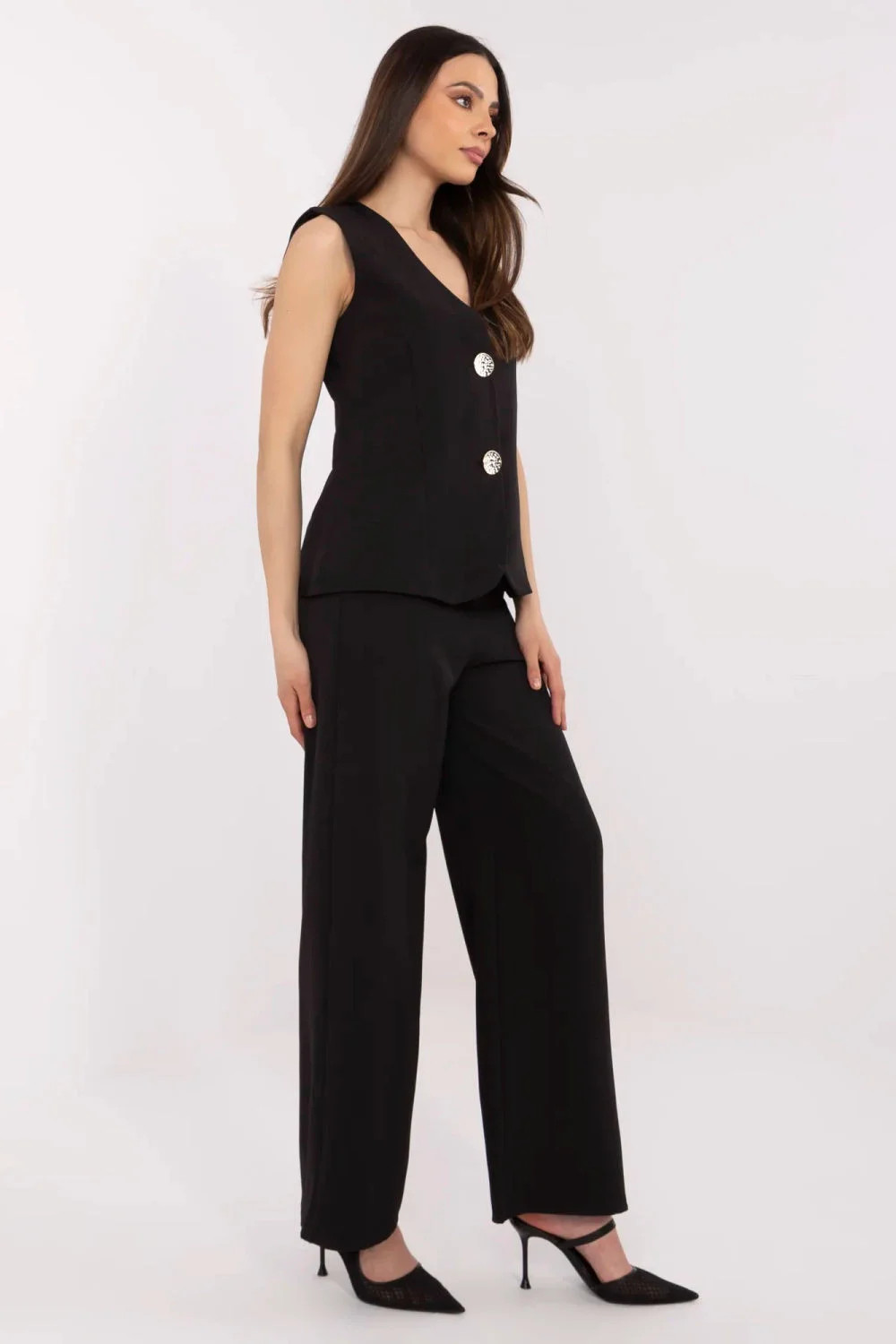 Elegantní dámský komplet skládající se z vesty a kalhot, ideální na formální události, do práce nebo na večírek. Vyrobený z vysoce kvalitního polyesteru a elastanu, tento materiál zaručuje pohodlí a odolnost a zároveň dodává celku jemnou eleganci. Komplet skvěle kombinuje pohodlí s profesionálním stylem, což z něj činí ideální volbu pro formální události. Vesta s výstřihem do srdce a zapínáním na knoflíky skvěle ladí se širokými, dlouhými nohavicemi kalhot s vysokým pasem. Kalhoty mají boční kapsy, které přidávají praktičnost a moderní charakter. Hladký vzor dělá tento komplet nadčasový a velmi univerzální. Ideální na elegantní setkání, do kanceláře nebo na večerní výlety, zajišťuje pohodlí a eleganci v každé situaci.
