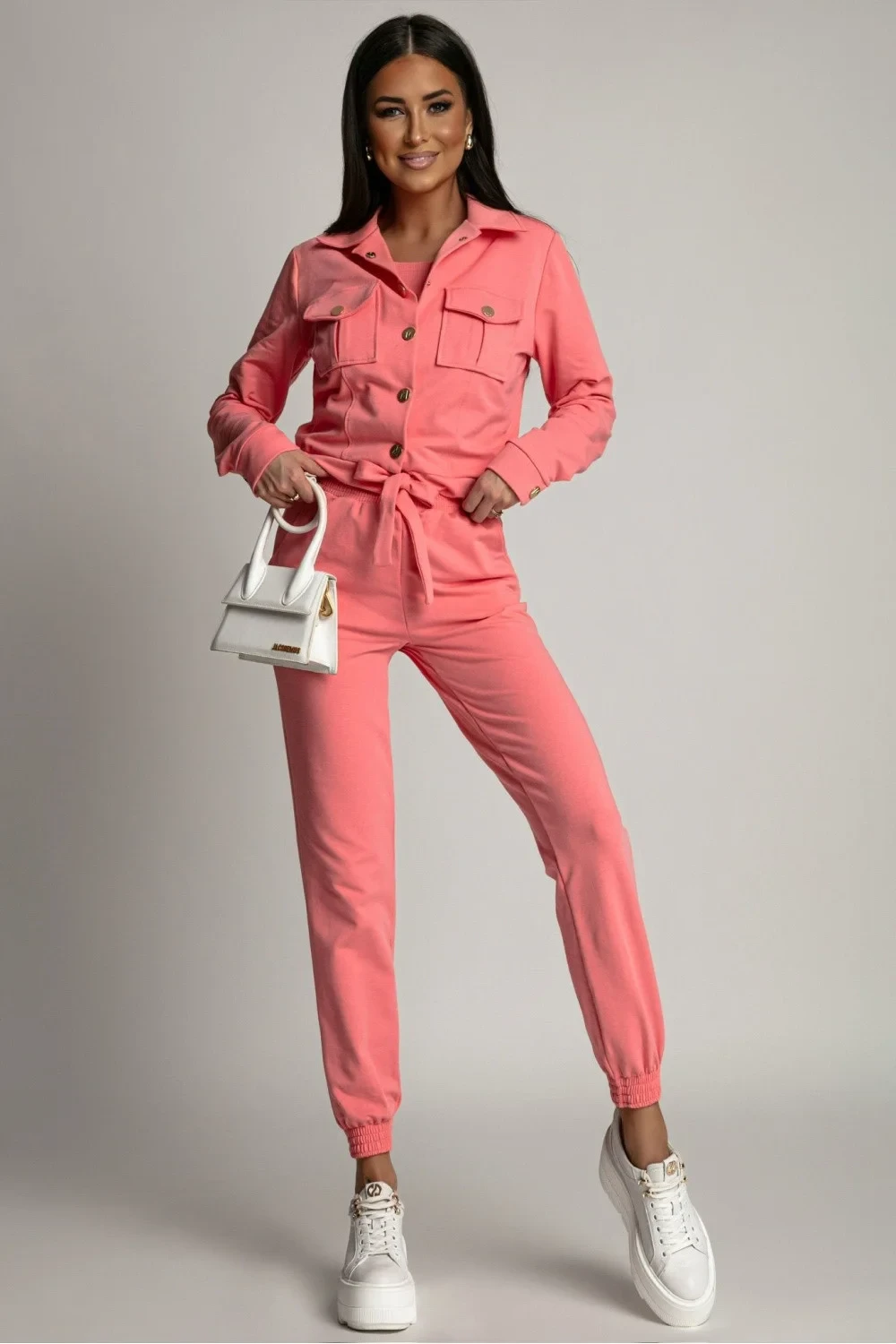 Představujeme třídílný teplý set Milano v barvě béžové, ideální pro každodenní stylizace a sportovní aktivity. Součástí setu je triko, mikina a kalhoty, které nejen poskytují pohodlí, ale také stylový vzhled. Triko s ramínky a kulatým výstřihem. Mikina s dlouhým rukávem, límečkem a zapínáním na knoflíky. Na spodním okraji mikiny je navíc šňůrka pro lepší přizpůsobení obvodu. Dlouhé kalhoty s kapsami, v pase s gumou. Všechny části setu jsou vyrobeny z vysoce kvalitní 100% bavlny, což zaručuje pohodlnost nošení i po celý den. Set Milano je skvělou volbou pro ženy, které si cení stylu a pohodlí.