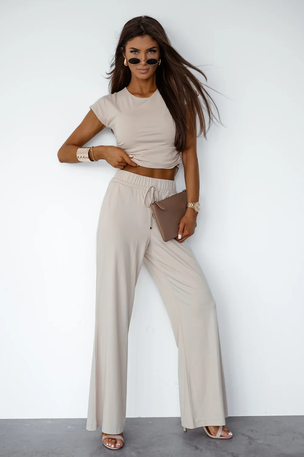 Kompletní s viskózou a přídavkem elastanu je ideální nabídkou na každodenní nošení i na volnější příležitosti. Součástí setu je tričko s krátkým rukávem a klasickým kulatým výstřihem, které jemně zdůrazňuje postavu a poskytuje pohodlné nošení. Doplňkem setu jsou dlouhé kalhoty s elastickým pásem a šněrováním v pasu, které umožňují ideální přizpůsobení pasu. Na bocích jsou praktické kapsy. Lehký, prodyšný materiál s příměsí elastanu dělá set měkký, elastický a pohodlný, skvělý jak na odpočinek, tak na každodenní aktivity.
