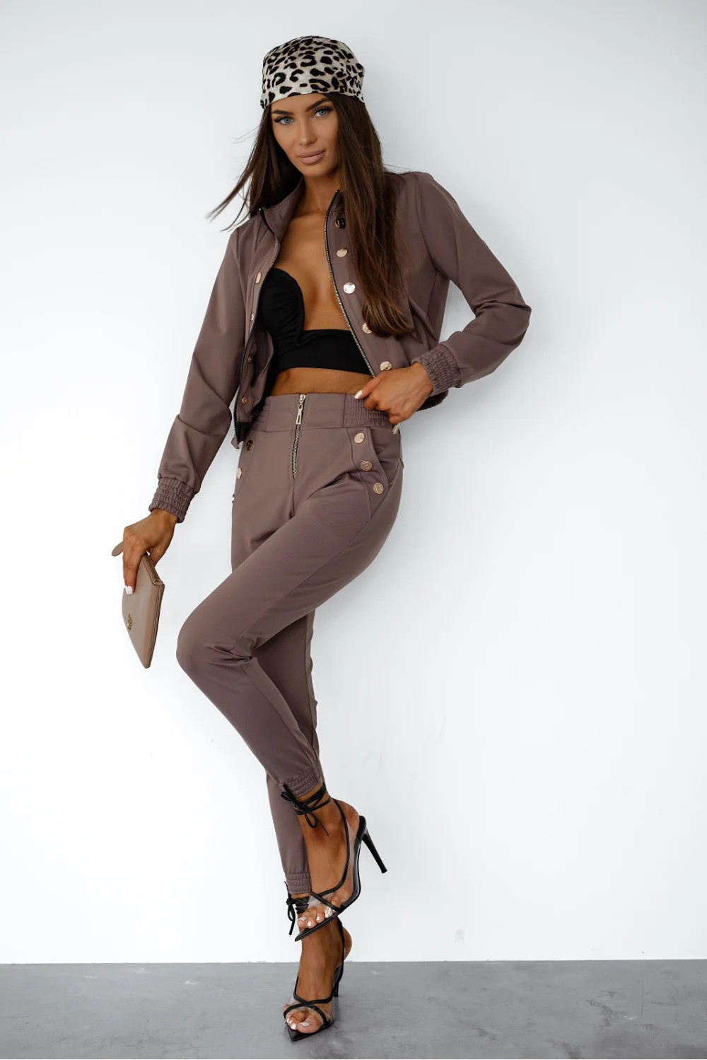 Elegantní a pohodlný dámský komplet, ideální na každý den a speciální příležitosti. Dlouhé kalhoty s úzkými nohavicemi krásně zdůrazňují postavu a vsunuté kapsy dodávají praktičnost. Díky elastickému pásku v pasu a zapínání na zip vpředu poskytují pohodlí a skvělé přizpůsobení. Mikina s dlouhým rukávem a nízkým stojanem dodává celku elegantní charakter a její zapínání na zip usnadňuje nošení. Ozdobné knoflíky na přední straně přidávají decentní, stylový akcent. Je to ideální sada pro ženy, které ocení kombinaci pohodlí a módního vzhledu.