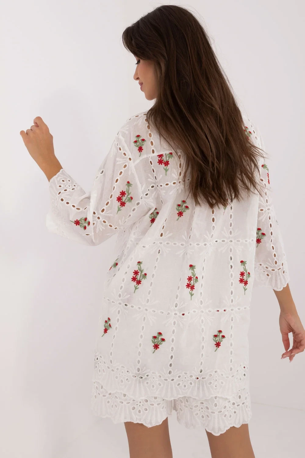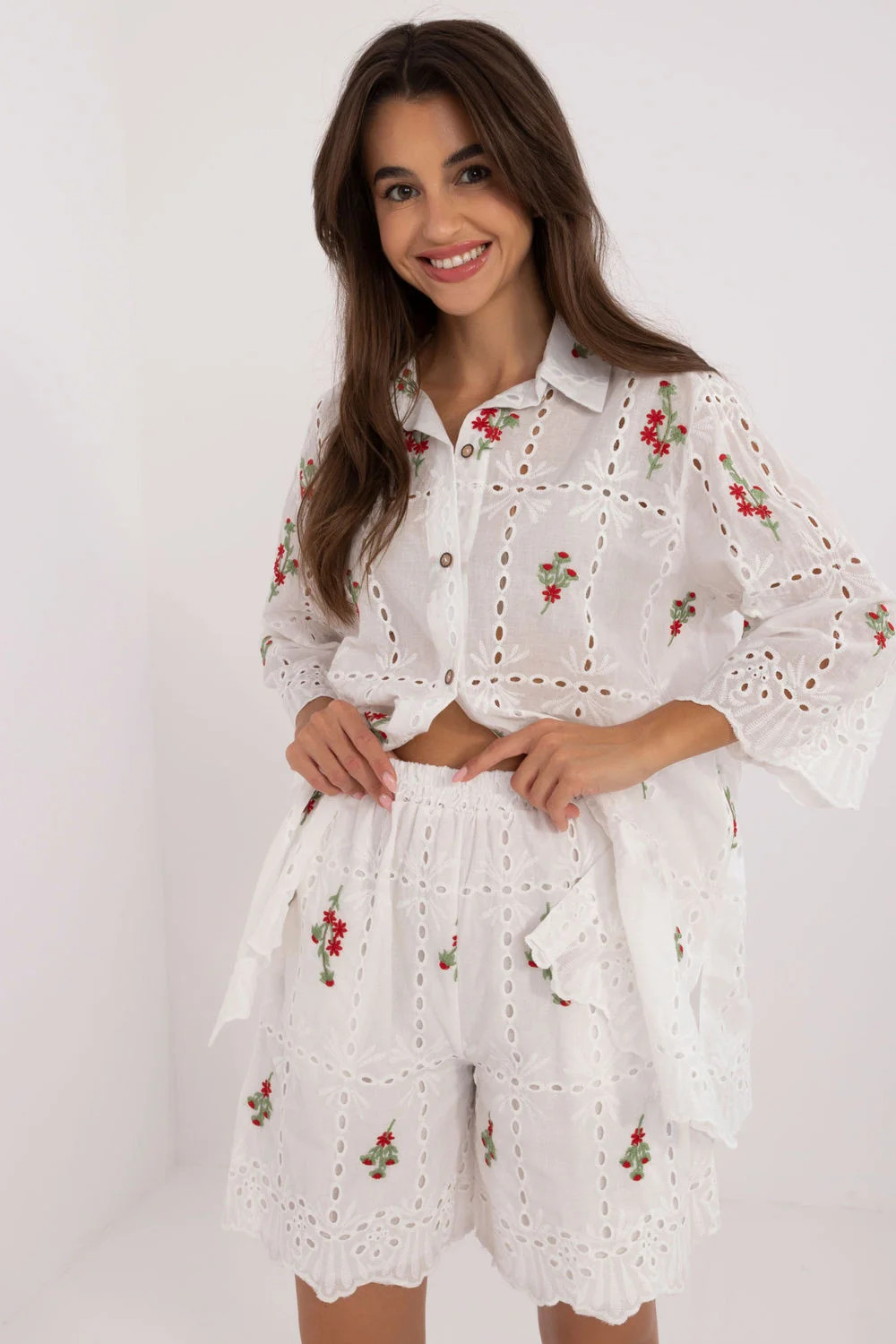 Dámský bavlněný set ve stylu casual je ideální volbou pro každodenní outfit s nádechem elegance. Součástí setu je košile s límečkem, zapínací na knoflíky, s 3/4 rukávem, skvělá na teplejší dny. Celkový vzhled je zdoben jemným ažurovým vzorem a decentním vyšíváním, které dodávají celku lehkost a ženský šarm. Šortky s širokými nohavicemi a vysokým pasem zajišťují pohodlí nošení, a elastický pás garantuje ideální přizpůsobení siluetě. Praktické boční kapsy zvyšují funkčnost setu. Vyrobený z prodyšné přírodní bavlny se tento set skvěle hodí jak na procházku, tak do domácího útulku.